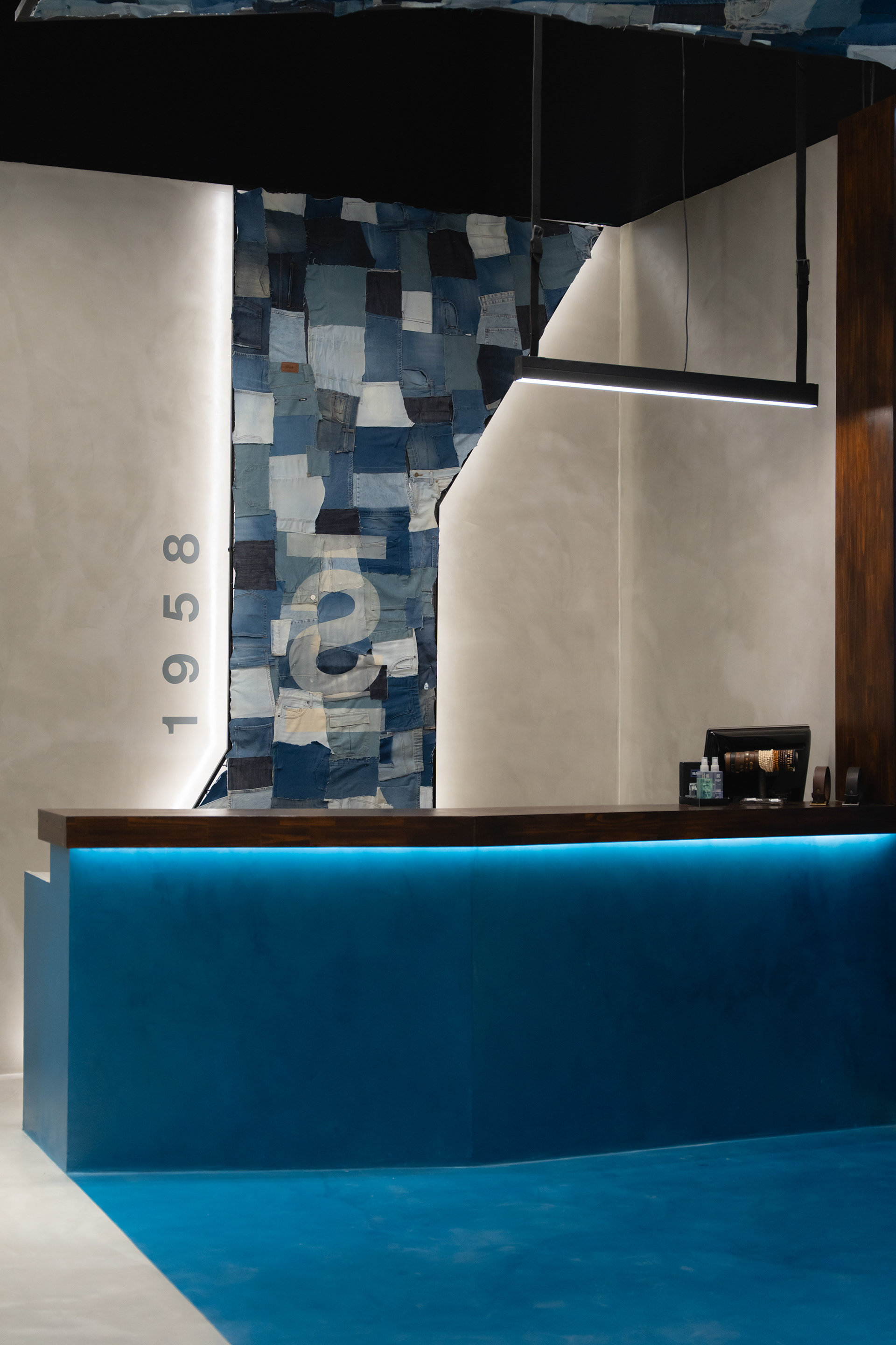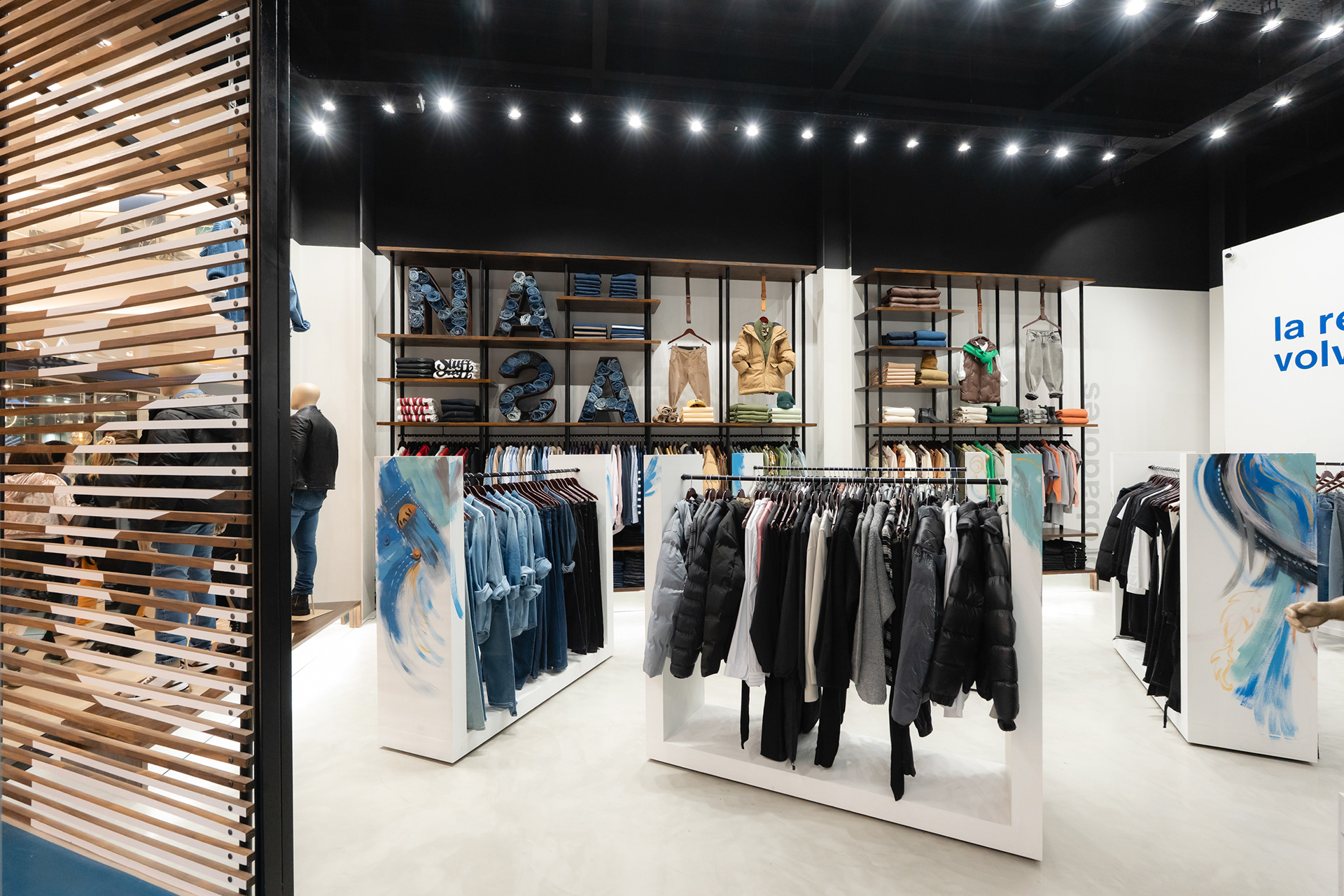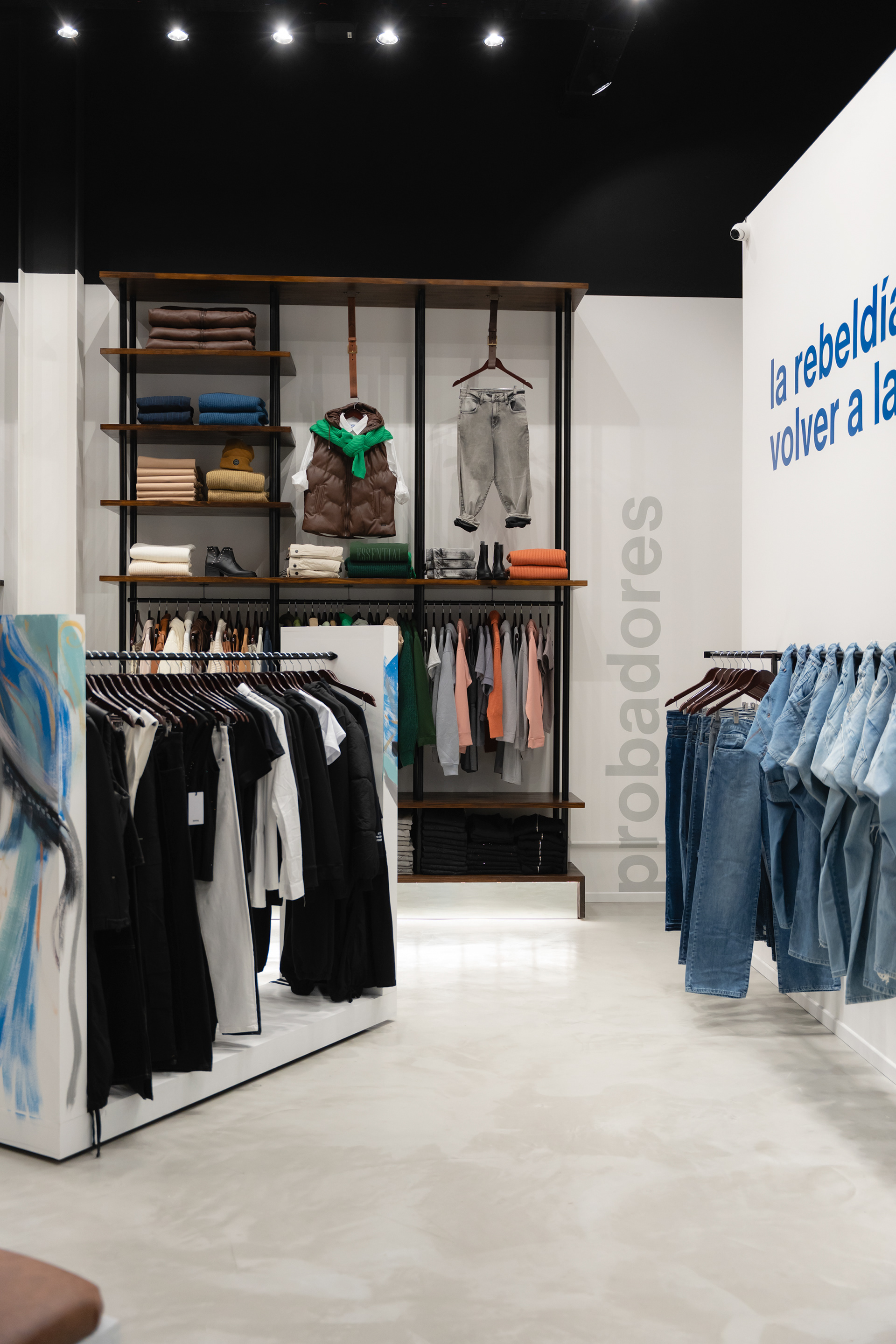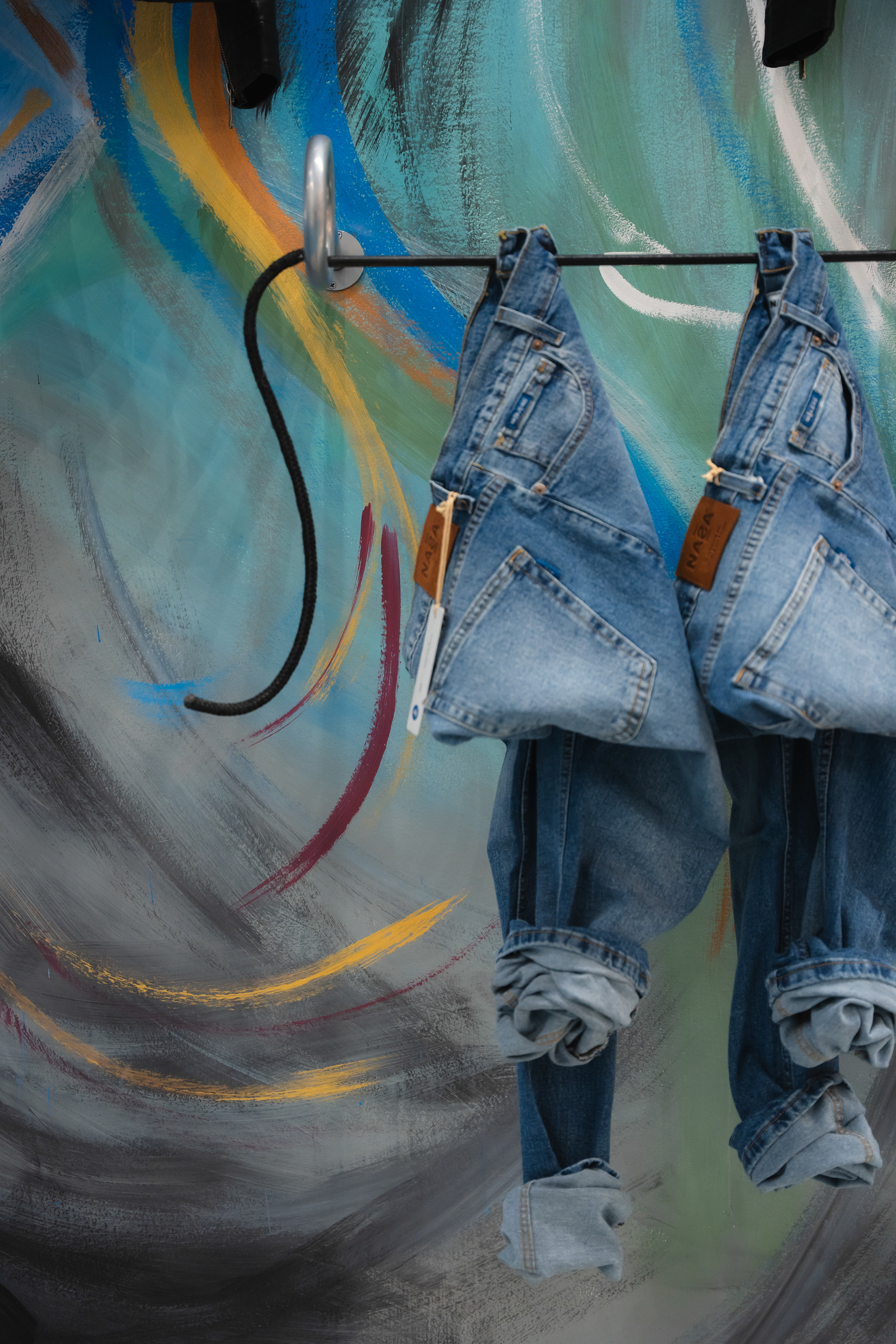 Se propuso crear un sistema identitario que pueda ser singular, replicable y adaptable a través de tres ejes: pinturas, mobiliario y decoración. Las pinturas del Arq. Giuseppe Lioi trascienden el rol de mural e interactúan con los productos y el equipamiento del local: si bien pueden aparentar una composición abstracta, proponen una temática conceptual —con la paleta de colores de la temporada como vehículo— entorno a los elementos de las prendas, dando pie a pensar en recursos análogos para el resto del sistema. En la búsqueda por vincular visualmente el principio con el fin del proceso de confección, se montó una estructura de carreteles, ojales e hilos (trabajando con el principio de escala y sobredimensionando sus magnitudes) que se entrelazan para conformar un tejido de exposición de prendas. De esta misma manera, se elaboraron “botones” de jean que funcionan como terminaciones para el mobiliario o como percheros de pared. Por último, el uso de cinturones y denim como elementos decorativos y expositivos resignifican su uso cotidiano.