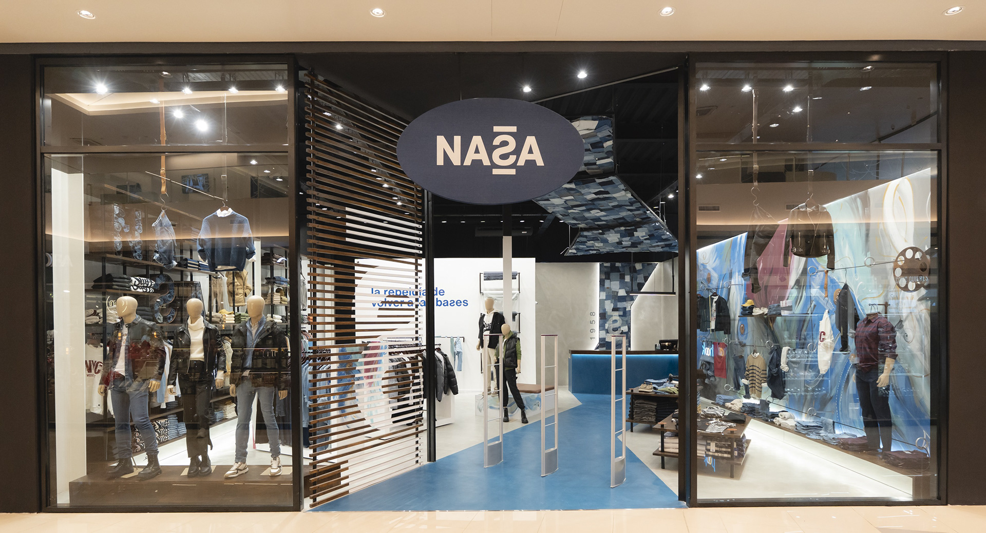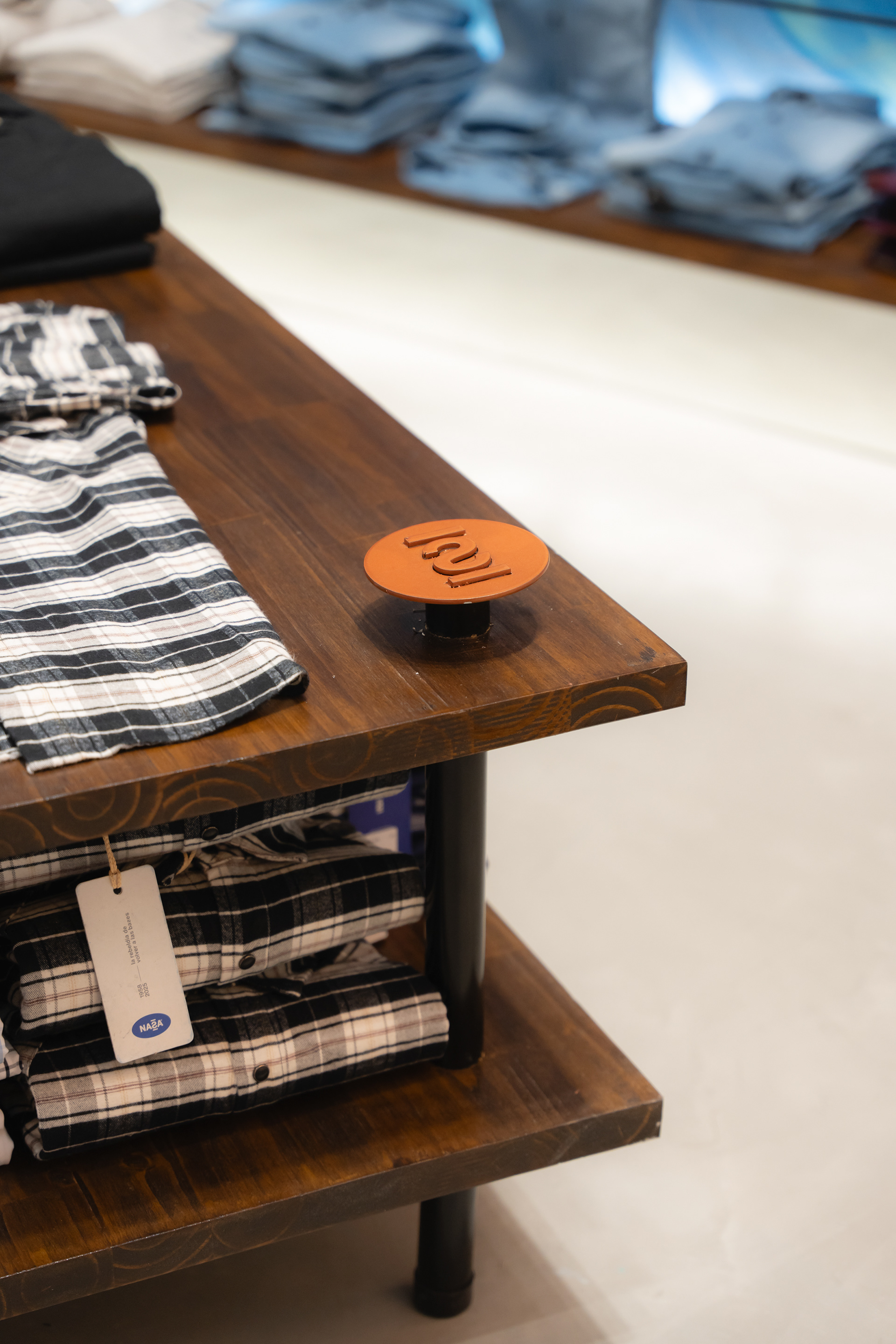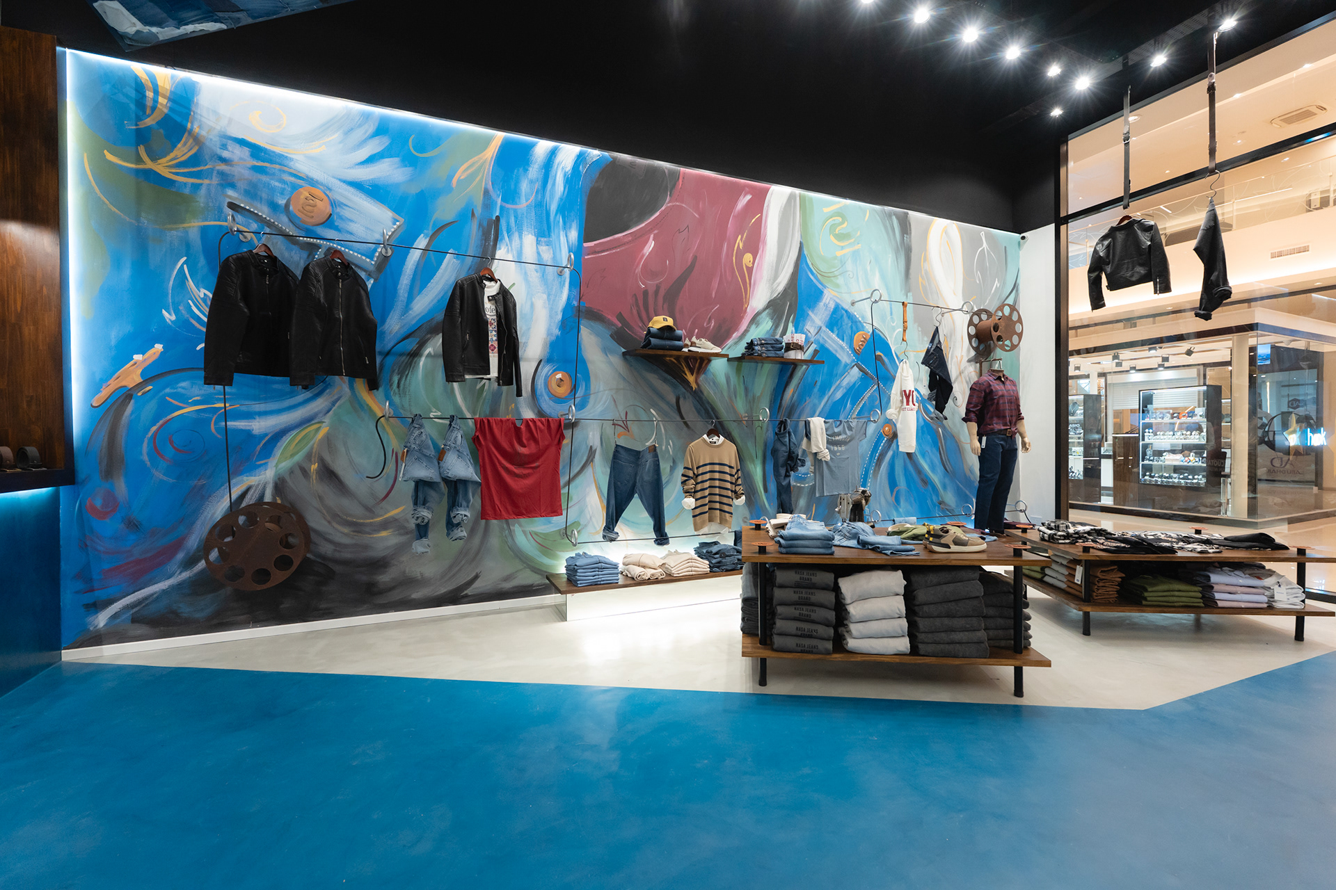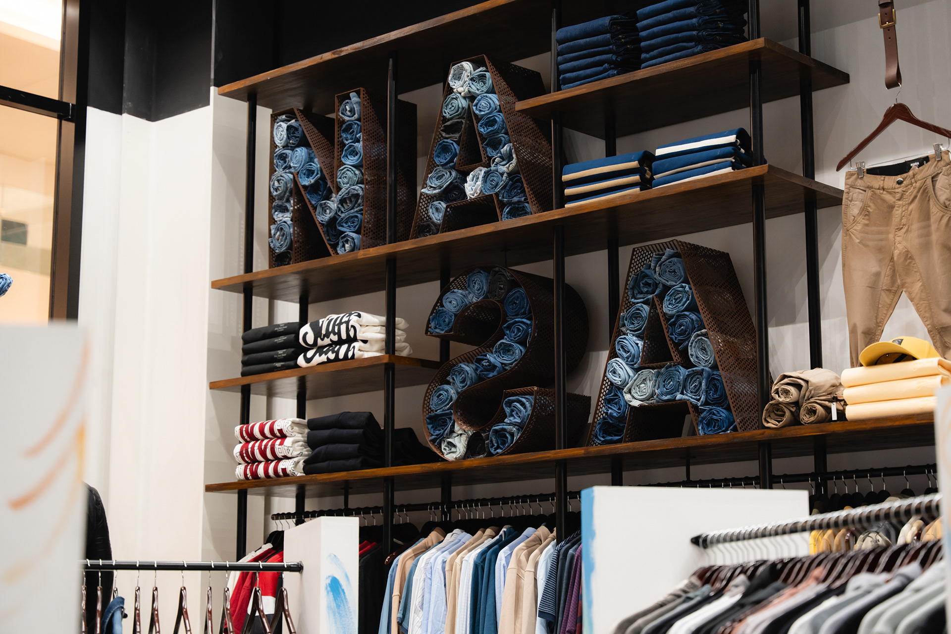 Se propuso crear un sistema identitario que pueda ser singular, replicable y adaptable a través de tres ejes: pinturas, mobiliario y decoración. Las pinturas del Arq. Giuseppe Lioi trascienden el rol de mural e interactúan con los productos y el equipamiento del local: si bien pueden aparentar una composición abstracta, proponen una temática conceptual —con la paleta de colores de la temporada como vehículo— entorno a los elementos de las prendas, dando pie a pensar en recursos análogos para el resto del sistema. En la búsqueda por vincular visualmente el principio con el fin del proceso de confección, se montó una estructura de carreteles, ojales e hilos (trabajando con el principio de escala y sobredimensionando sus magnitudes) que se entrelazan para conformar un tejido de exposición de prendas. De esta misma manera, se elaboraron “botones” de jean que funcionan como terminaciones para el mobiliario o como percheros de pared. Por último, el uso de cinturones y denim como elementos decorativos y expositivos resignifican su uso cotidiano.