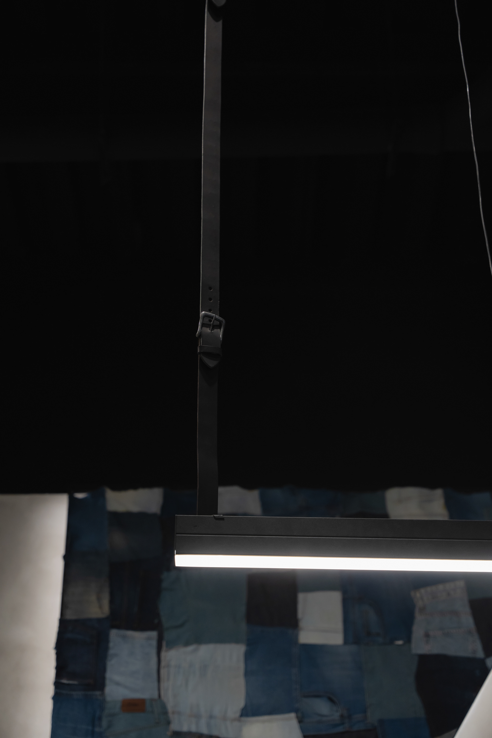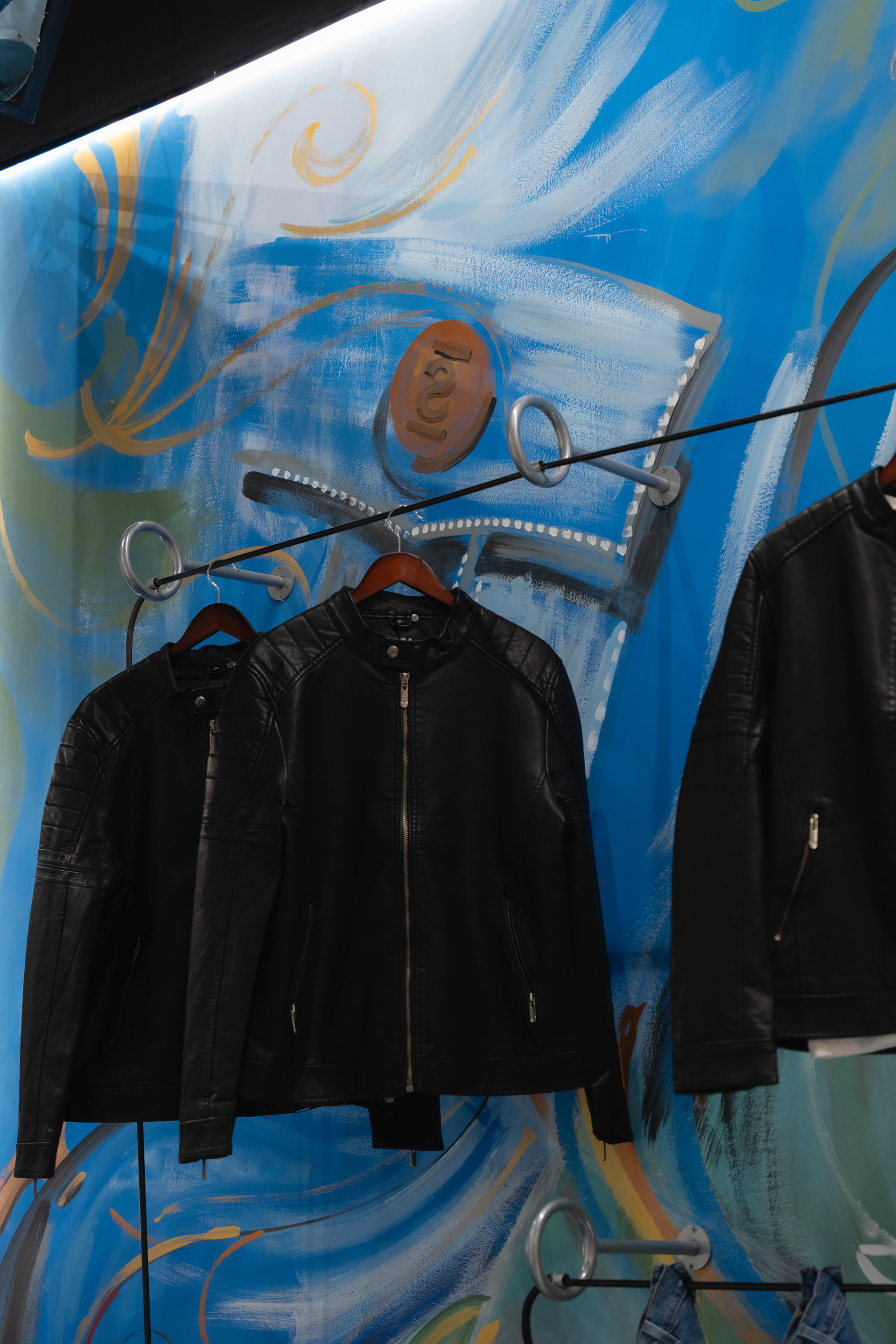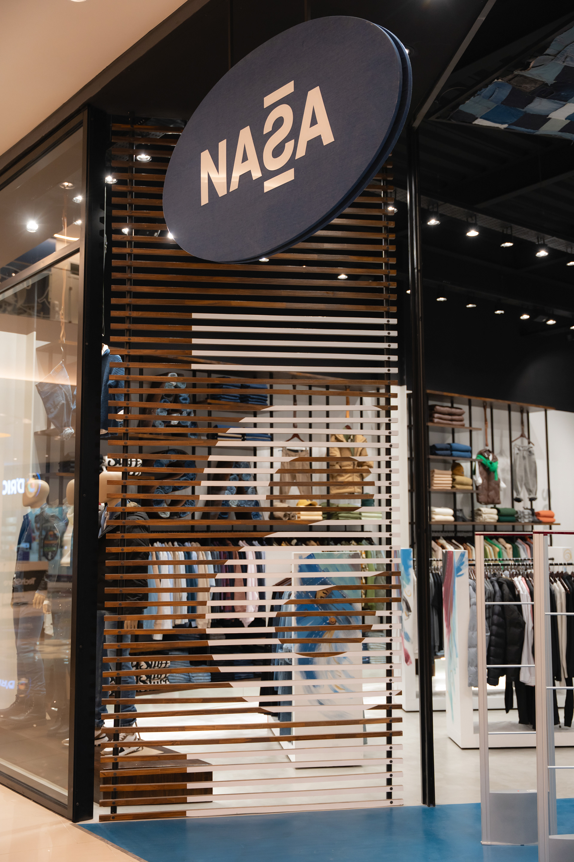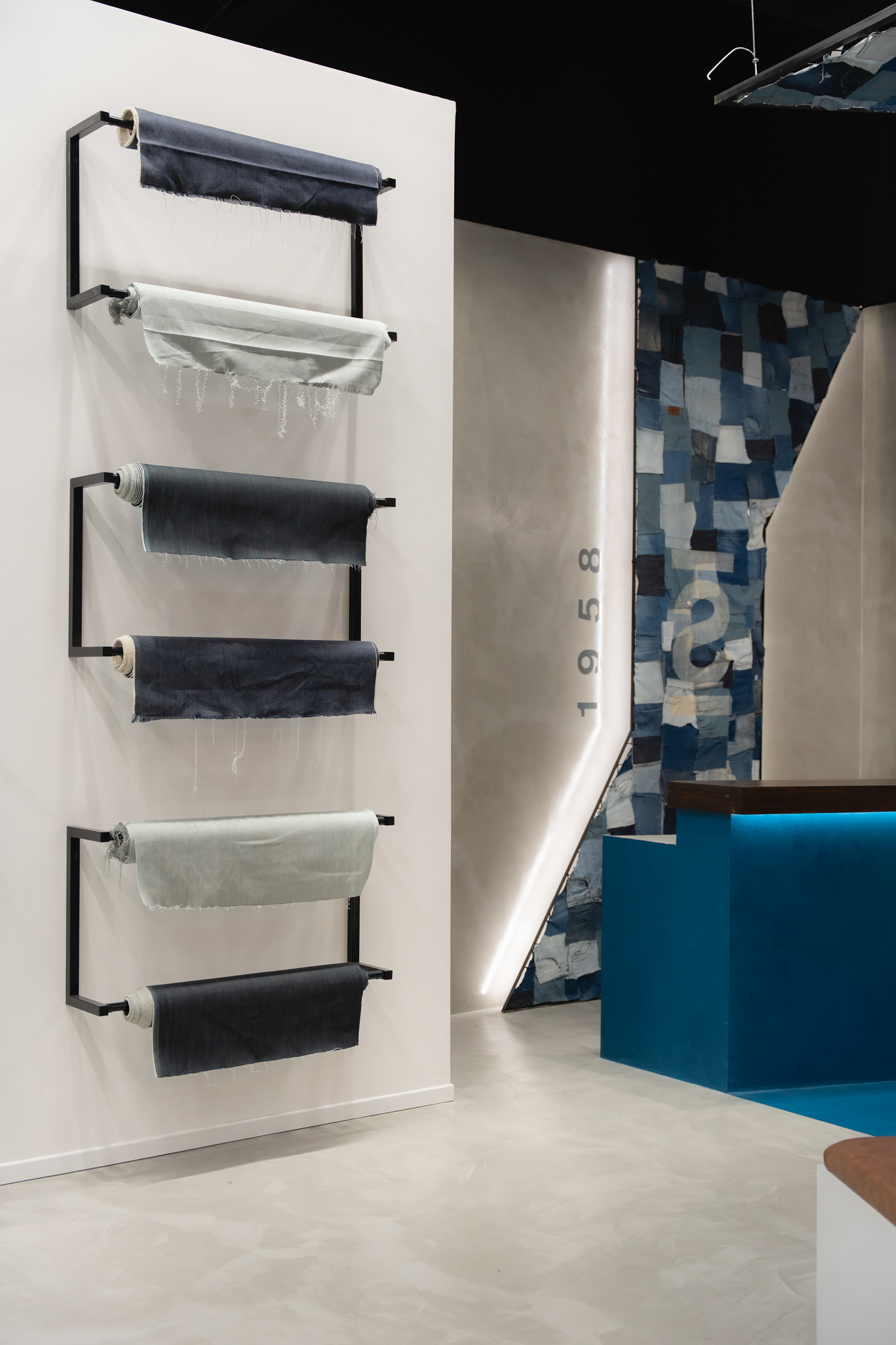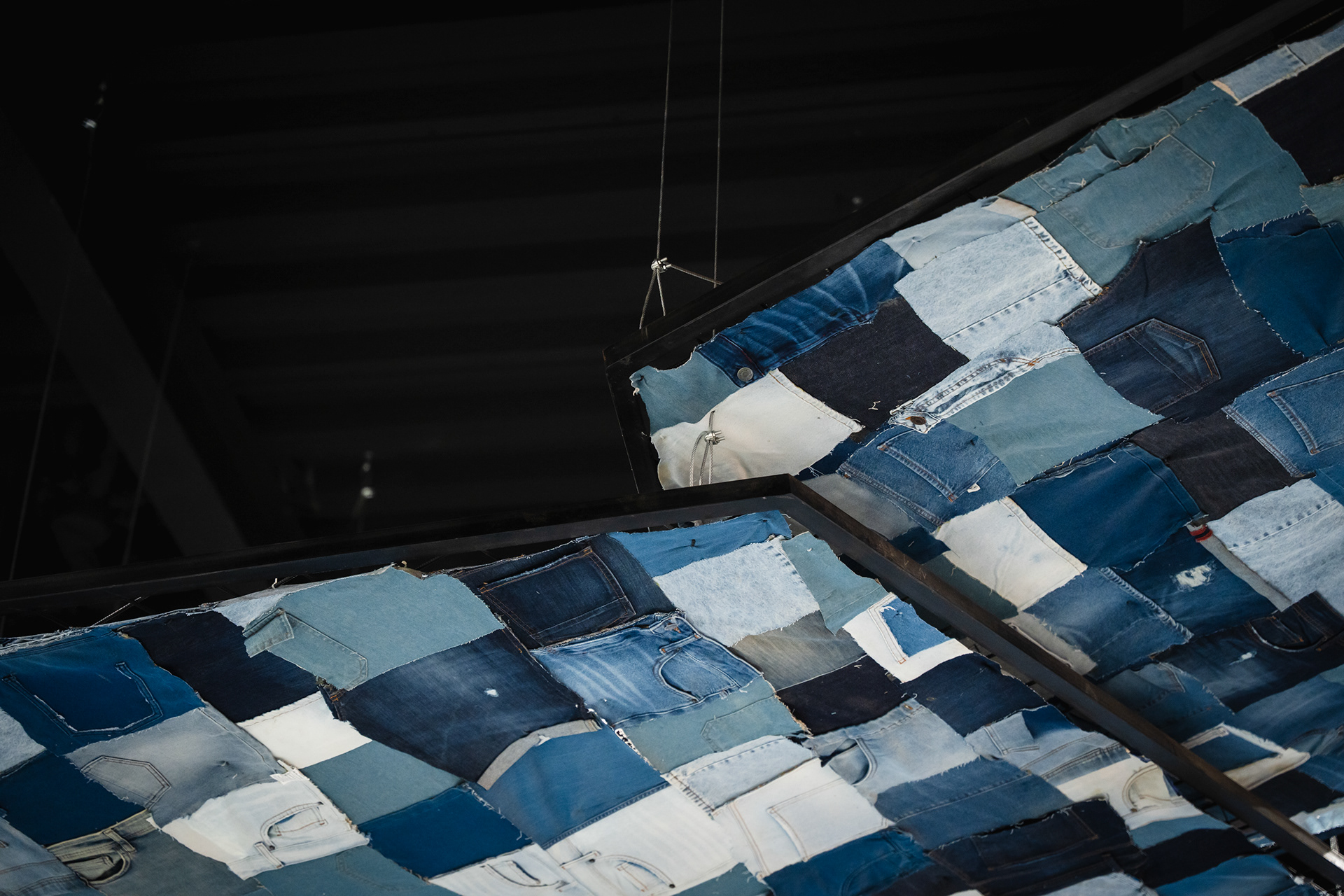 Se propuso crear un sistema identitario que pueda ser singular, replicable y adaptable a través de tres ejes: pinturas, mobiliario y decoración. Las pinturas del Arq. Giuseppe Lioi trascienden el rol de mural e interactúan con los productos y el equipamiento del local: si bien pueden aparentar una composición abstracta, proponen una temática conceptual —con la paleta de colores de la temporada como vehículo— entorno a los elementos de las prendas, dando pie a pensar en recursos análogos para el resto del sistema. En la búsqueda por vincular visualmente el principio con el fin del proceso de confección, se montó una estructura de carreteles, ojales e hilos (trabajando con el principio de escala y sobredimensionando sus magnitudes) que se entrelazan para conformar un tejido de exposición de prendas. De esta misma manera, se elaboraron “botones” de jean que funcionan como terminaciones para el mobiliario o como percheros de pared. Por último, el uso de cinturones y denim como elementos decorativos y expositivos resignifican su uso cotidiano.