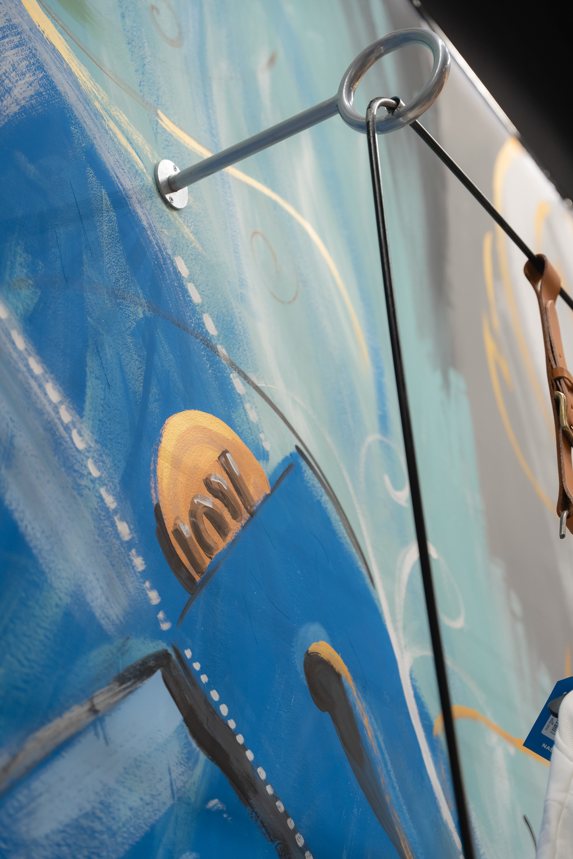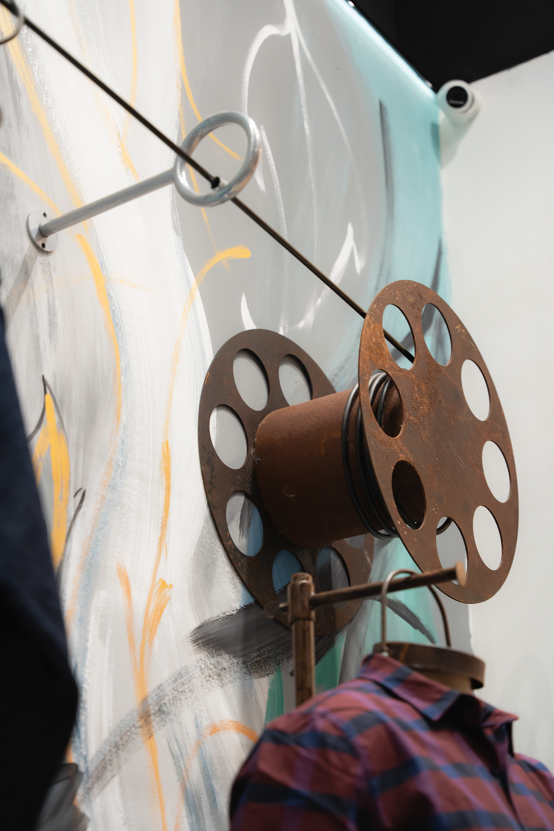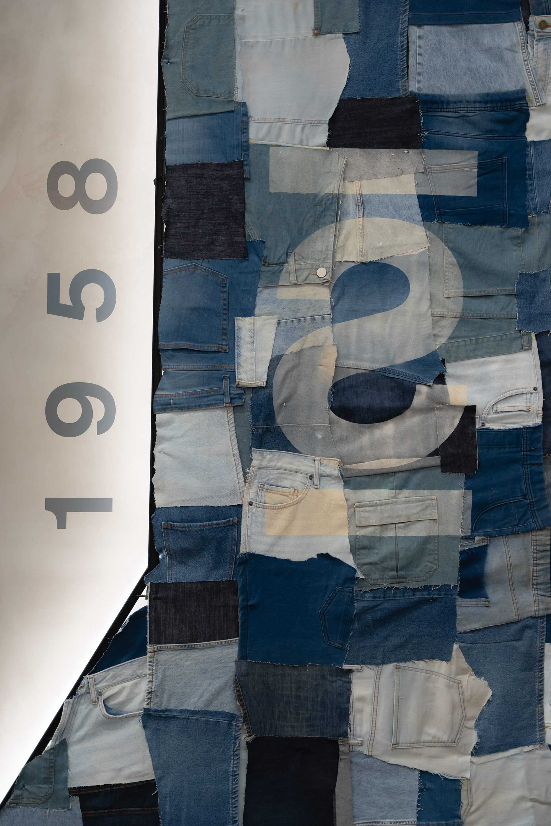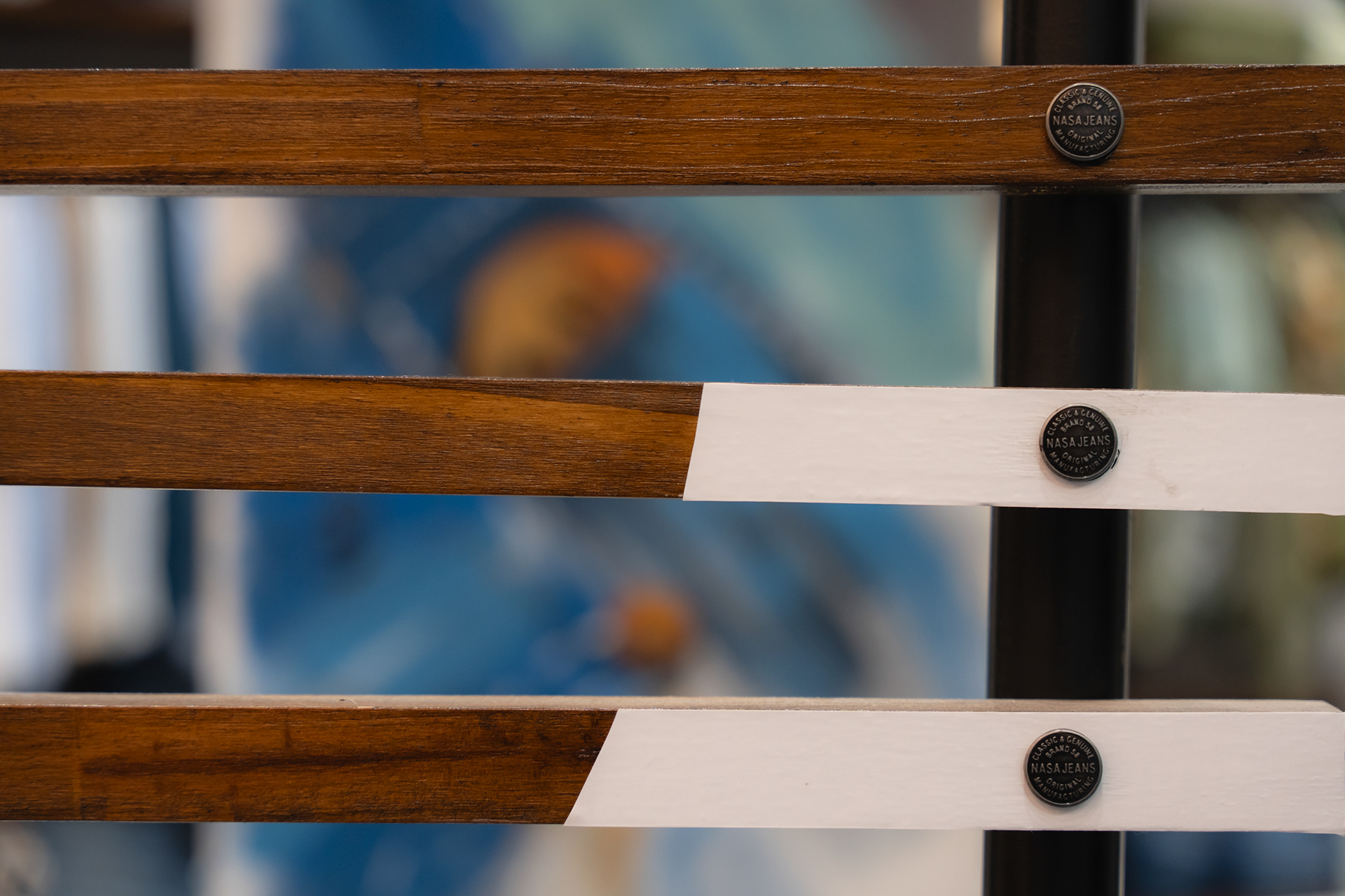 Se propuso crear un sistema identitario que pueda ser singular, replicable y adaptable a través de tres ejes: pinturas, mobiliario y decoración. Las pinturas del Arq. Giuseppe Lioi trascienden el rol de mural e interactúan con los productos y el equipamiento del local: si bien pueden aparentar una composición abstracta, proponen una temática conceptual —con la paleta de colores de la temporada como vehículo— entorno a los elementos de las prendas, dando pie a pensar en recursos análogos para el resto del sistema. En la búsqueda por vincular visualmente el principio con el fin del proceso de confección, se montó una estructura de carreteles, ojales e hilos (trabajando con el principio de escala y sobredimensionando sus magnitudes) que se entrelazan para conformar un tejido de exposición de prendas. De esta misma manera, se elaboraron “botones” de jean que funcionan como terminaciones para el mobiliario o como percheros de pared. Por último, el uso de cinturones y denim como elementos decorativos y expositivos resignifican su uso cotidiano.