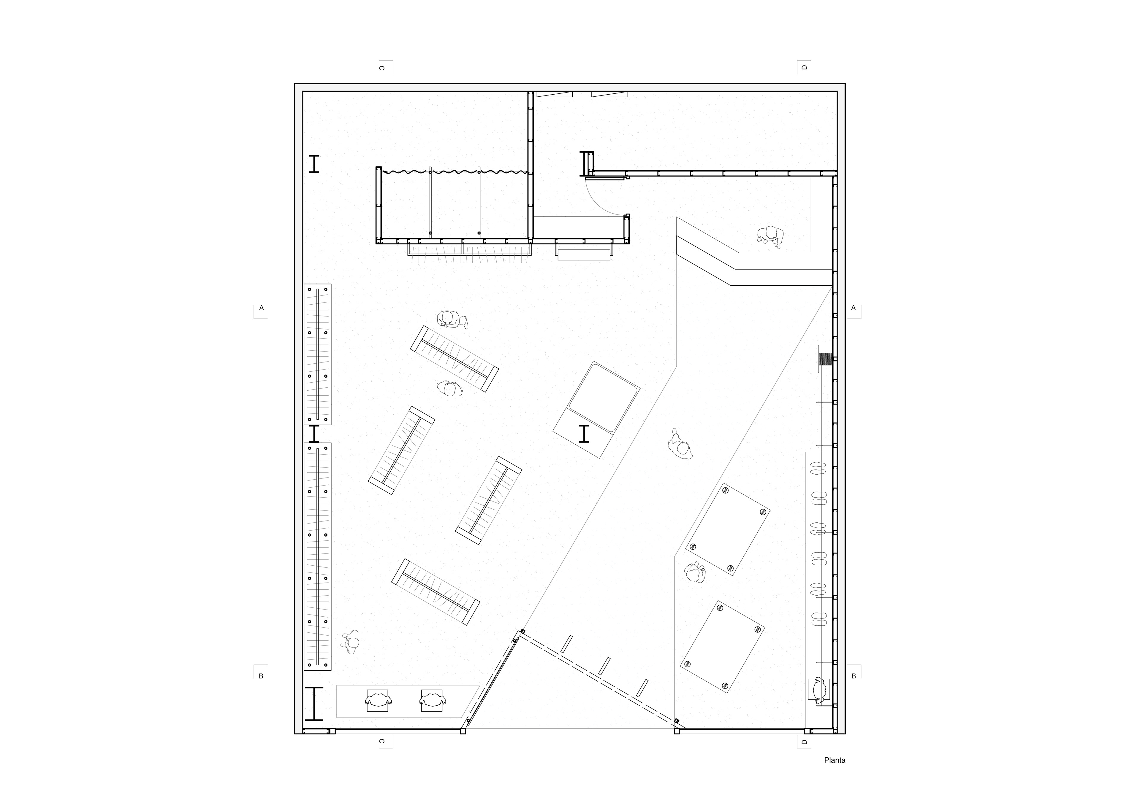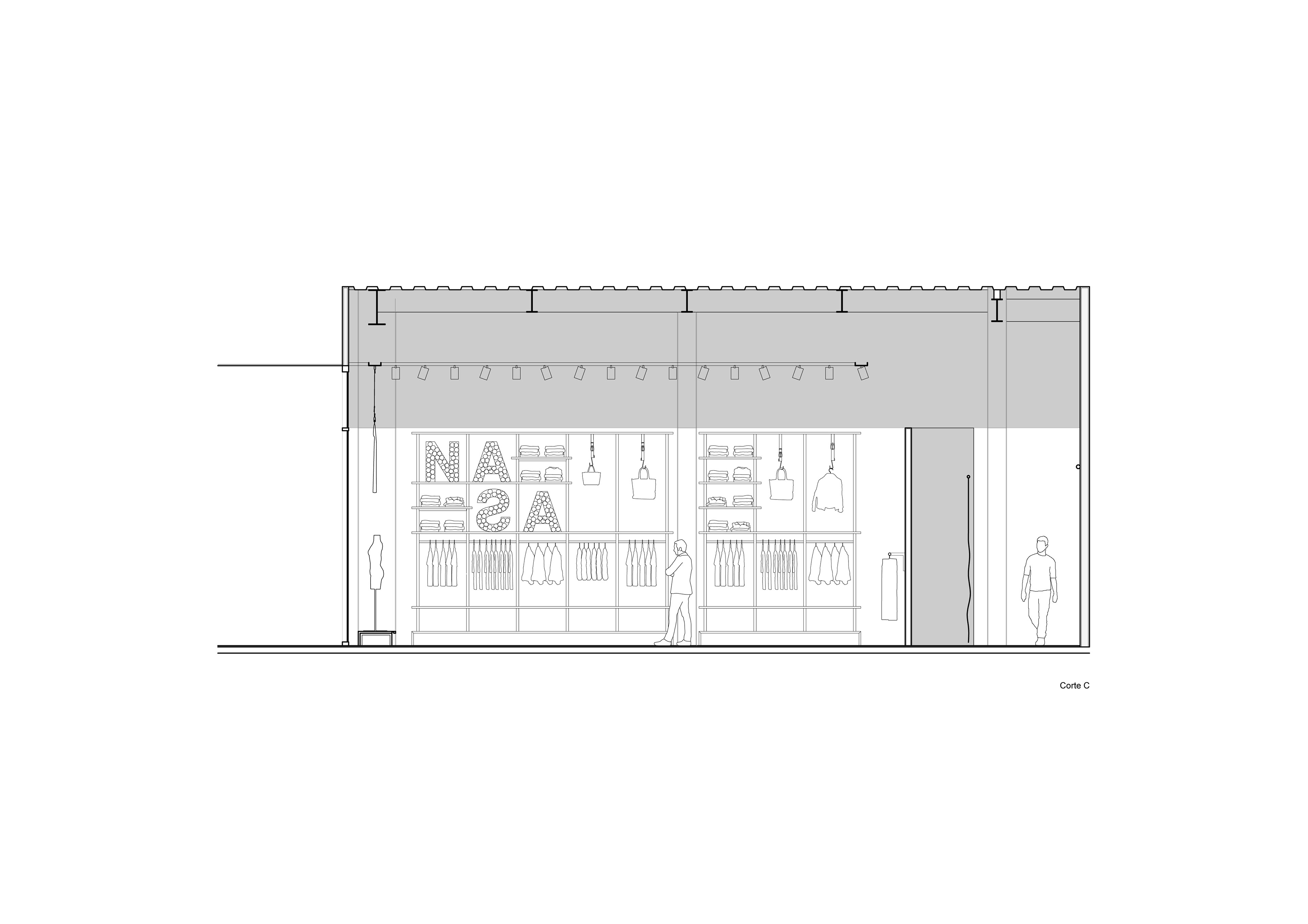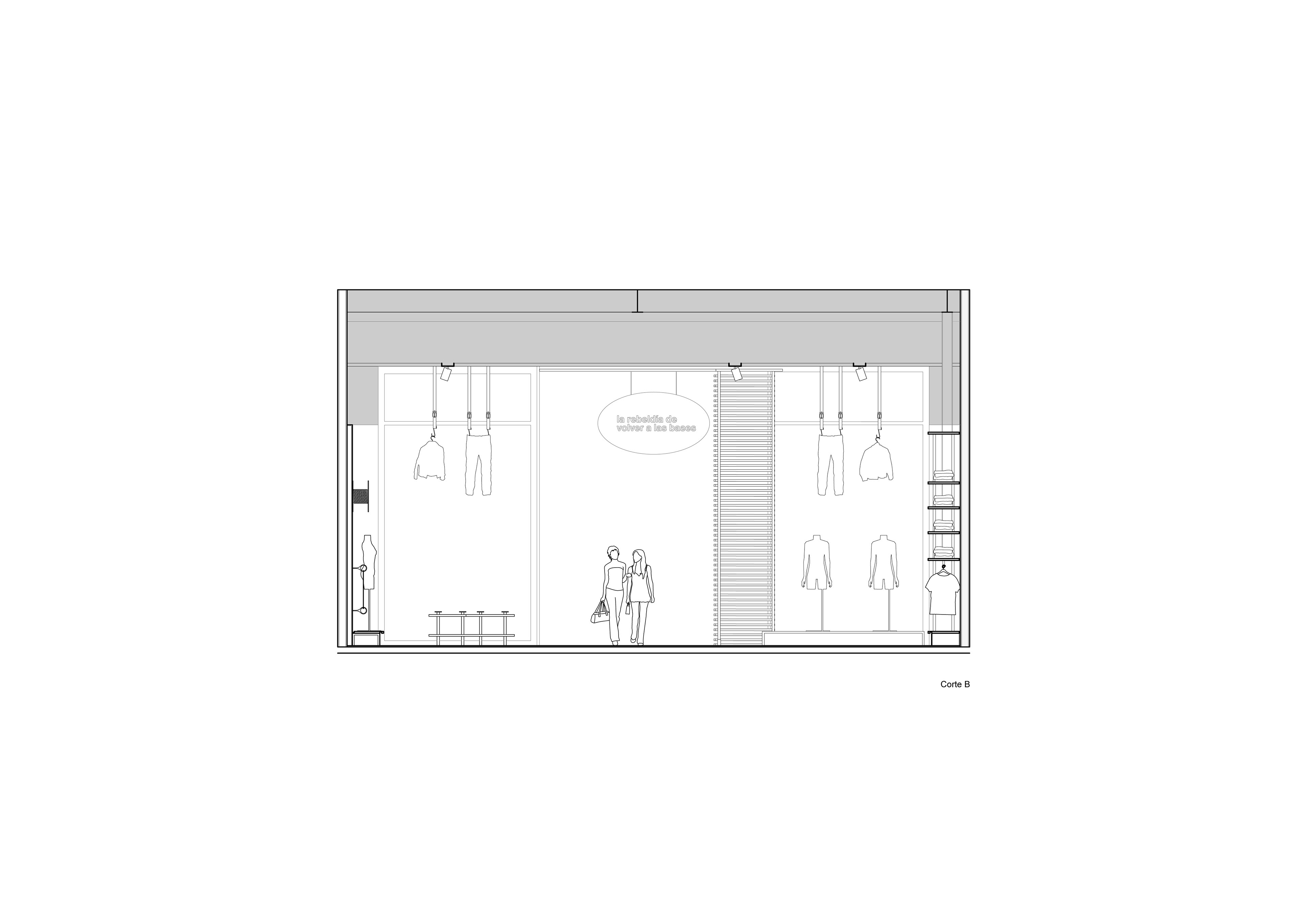 El diseño del presente local partió del análisis del flujo circulatorio del centro comercial para favorecer el ingreso, la exhibición de productos y resolver el problema que significaba la preexistencia de una columna de grandes dimensiones en el centro del espacio. Por ello, se lateralizó el mostrador generando una direccionalidad en diagonal a 30º (materializada en el piso y en el espacio aéreo con elementos colgantes) que origina dos sectores virtualmente separados. Por una parte, esto permite una gran vidriera ampliada en el lateral del local que se enfrenta con la diagonal, mientras que se compensa con una mayor carga de prendas en el sector opuesto. Por último, se prestó real atención a la privacidad que requieren los ingresos a los probadores y al depósito evitando una visual directa desde los espacios principales y exteriores.