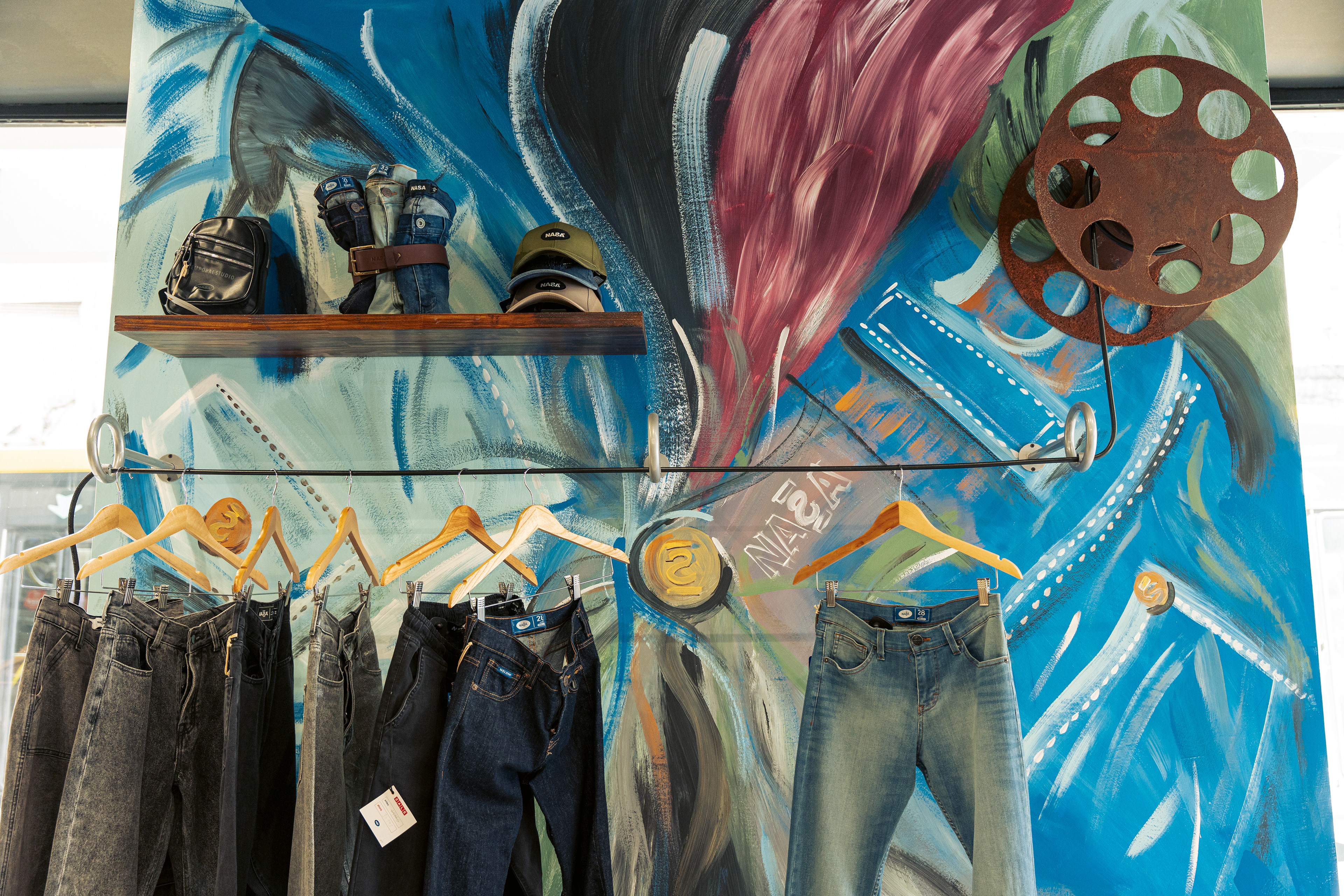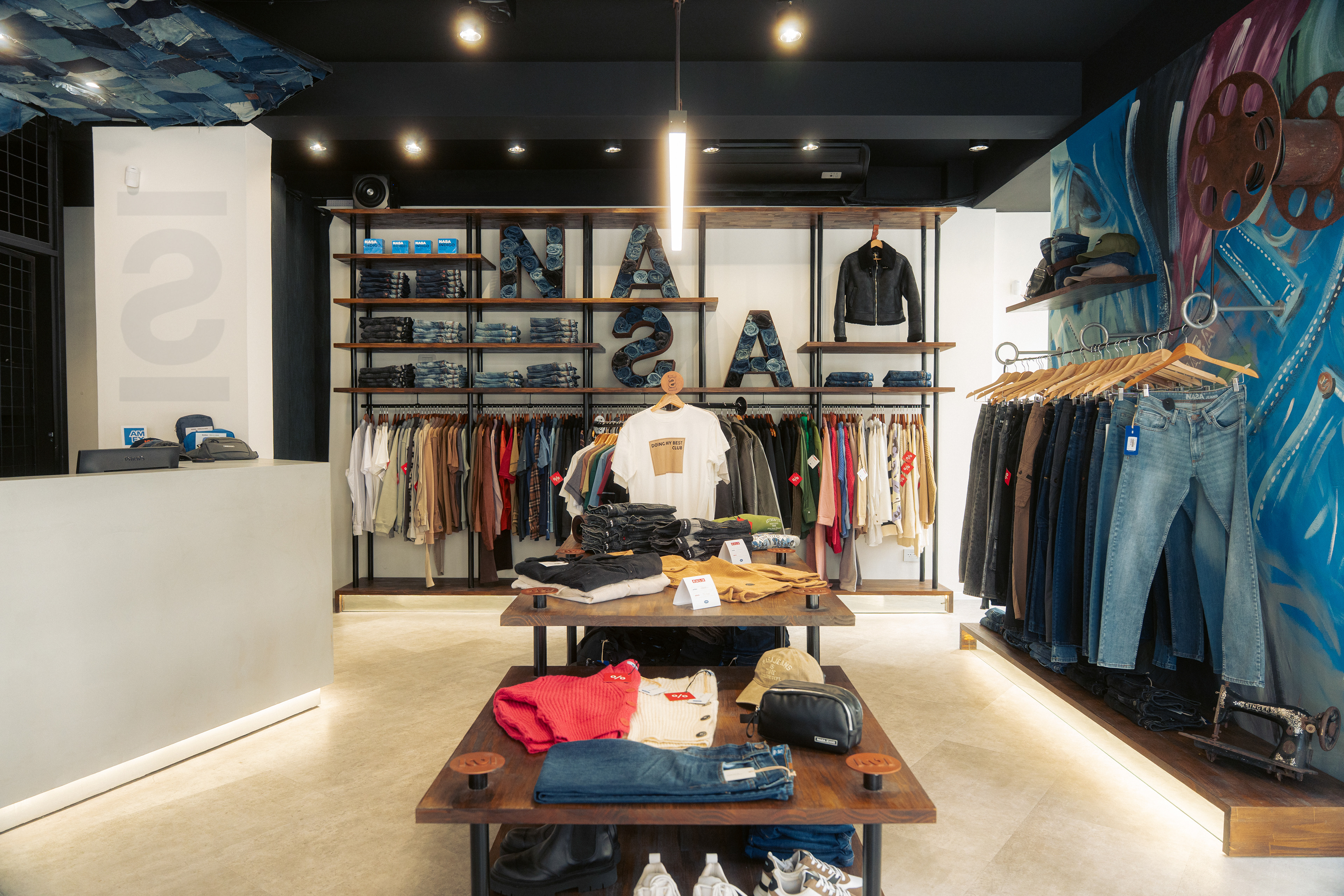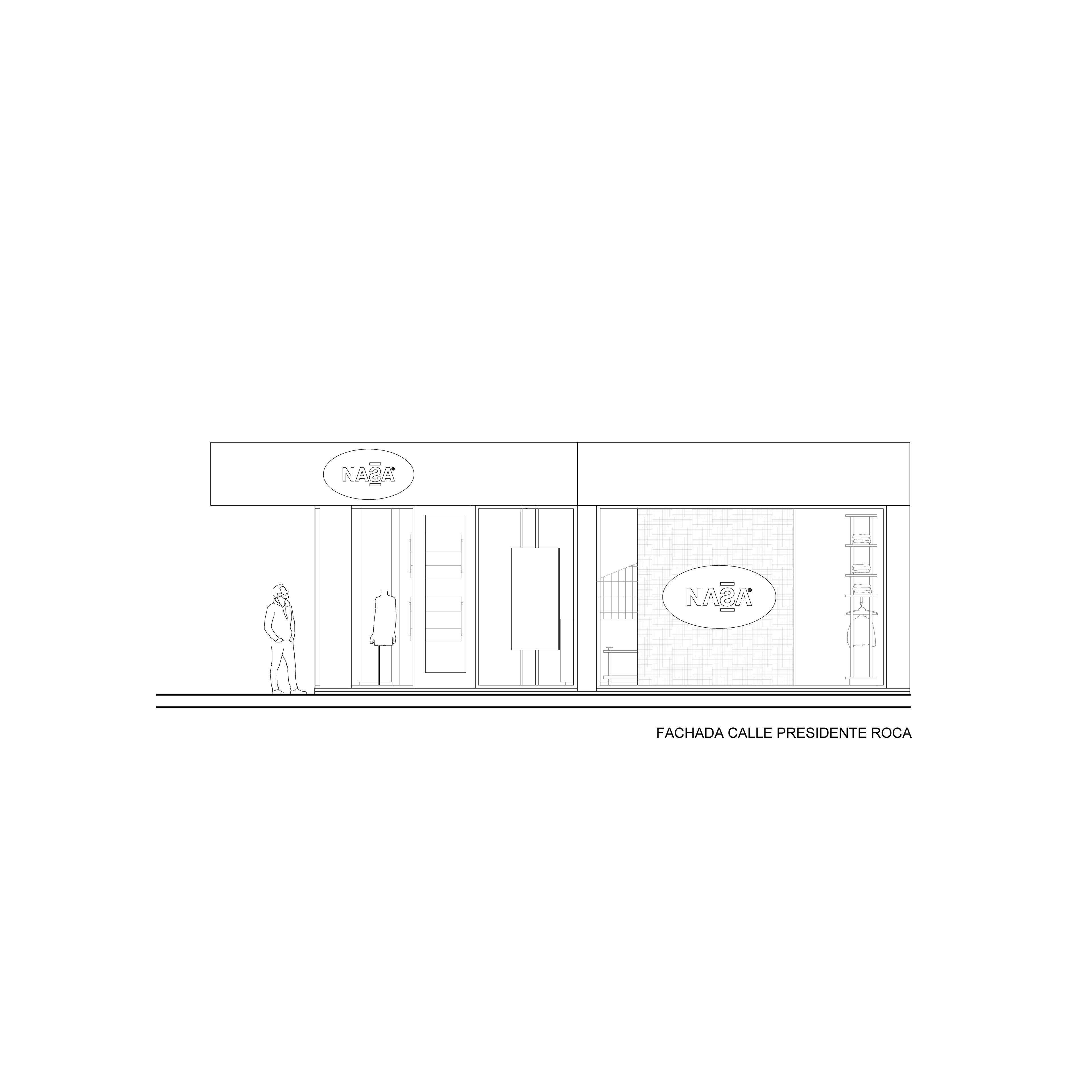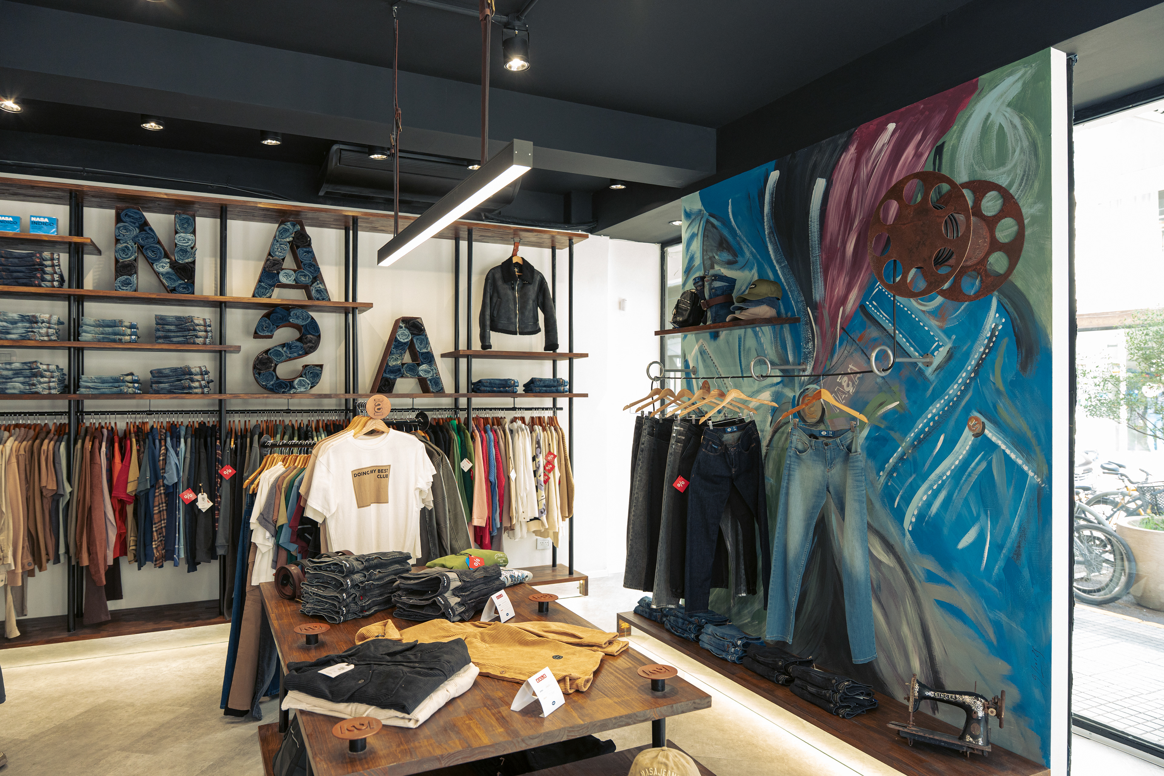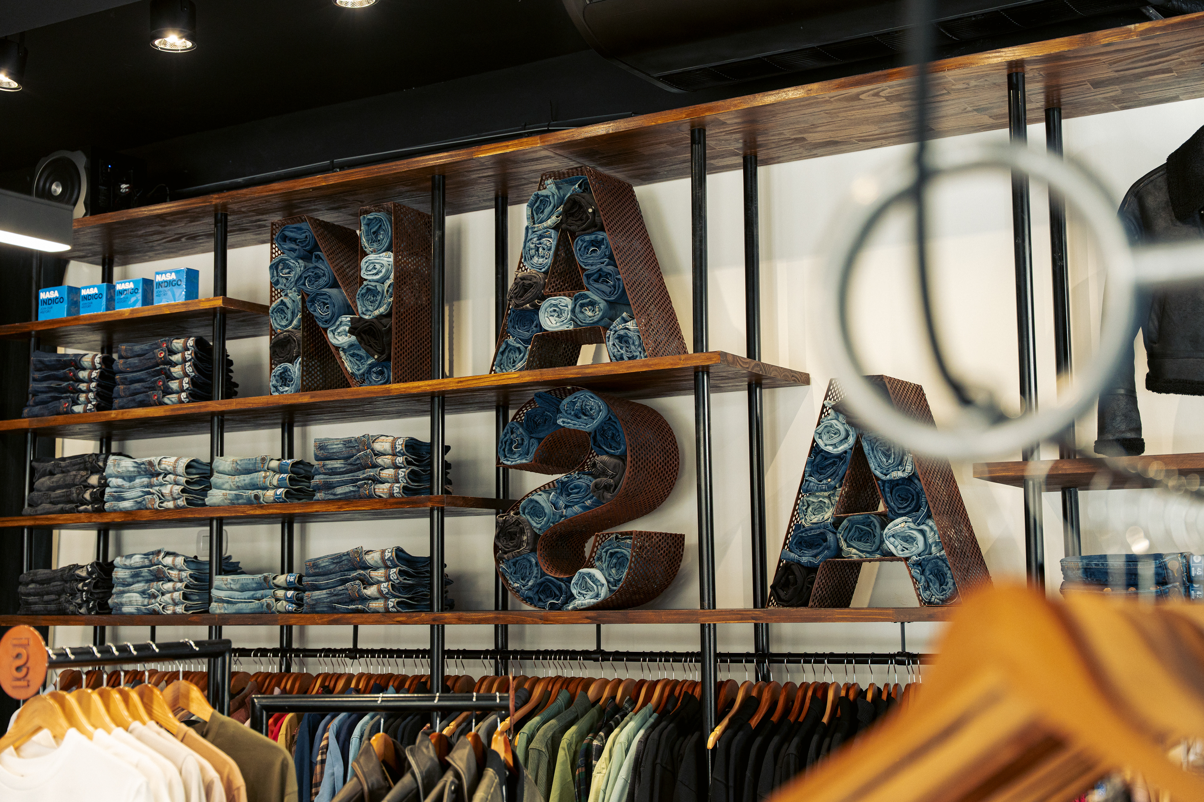 El diseño de este segundo local de indumentaria proyectado para NASA es parte de un proyecto integral bajo el concepto “la rebeldía de volver a las bases”, idea central de la nueva línea comunicacional para la marca. Por lo tanto, se trabajó aplicando el sistema identitario —retazos de jean, objetos de confección, elementos de prendas, mobiliario, pinturas con su debida paleta cromática, iluminación, etc.— adaptándolo a las nuevas características del emplazamiento; superficie pequeña y gran exposición de marca. Por ello, se decide utilizar las vidrieras no solo para exhibir prendas, sino también para comunicar a los transeúntes la nueva presencia de NASA con local exclusivo en el centro de la ciudad de Rosario. Así, mediante una única operación se resuelven ambas cuestiones: se proyecta un tabique sobre la vidriera de calle Pte. Roca revestido en retazos de jean, con el logotipo como protagonista; mientras que, del lado interior del tabique, se pintó el mural interactivo que permite ampliar la superficie de exhibición de prendas dentro del local.