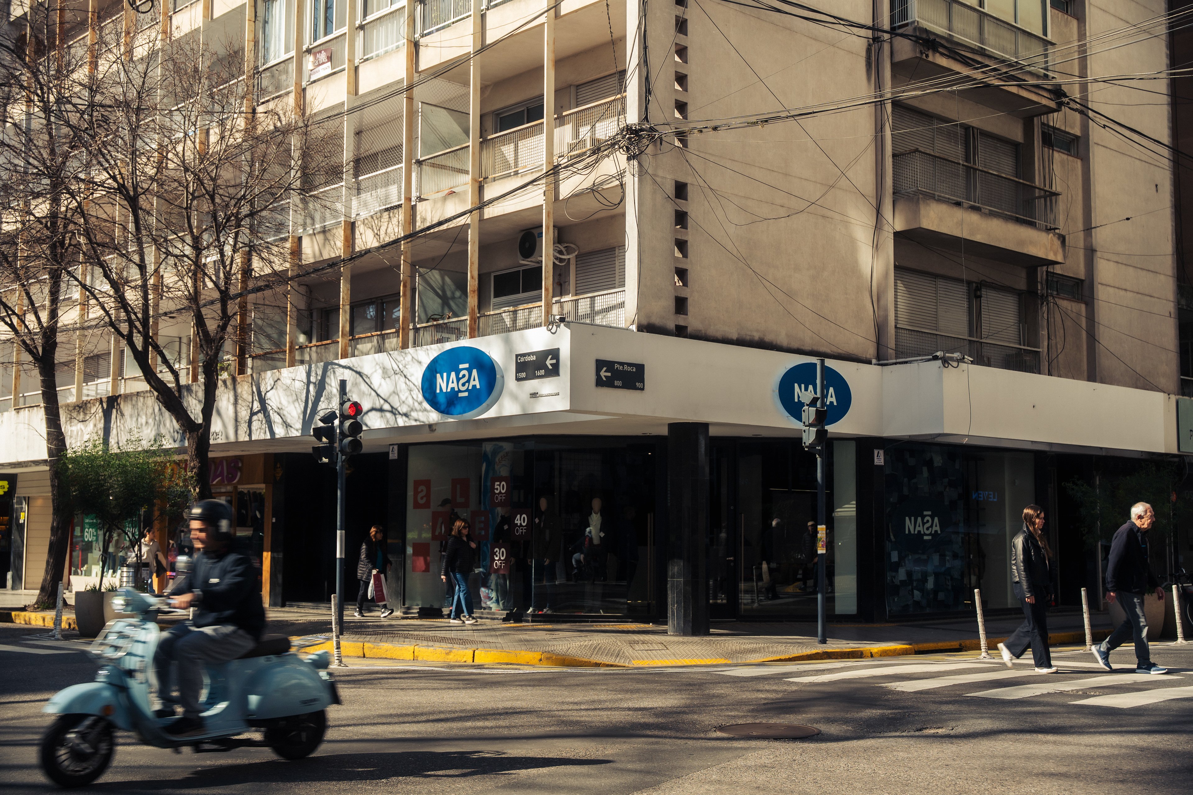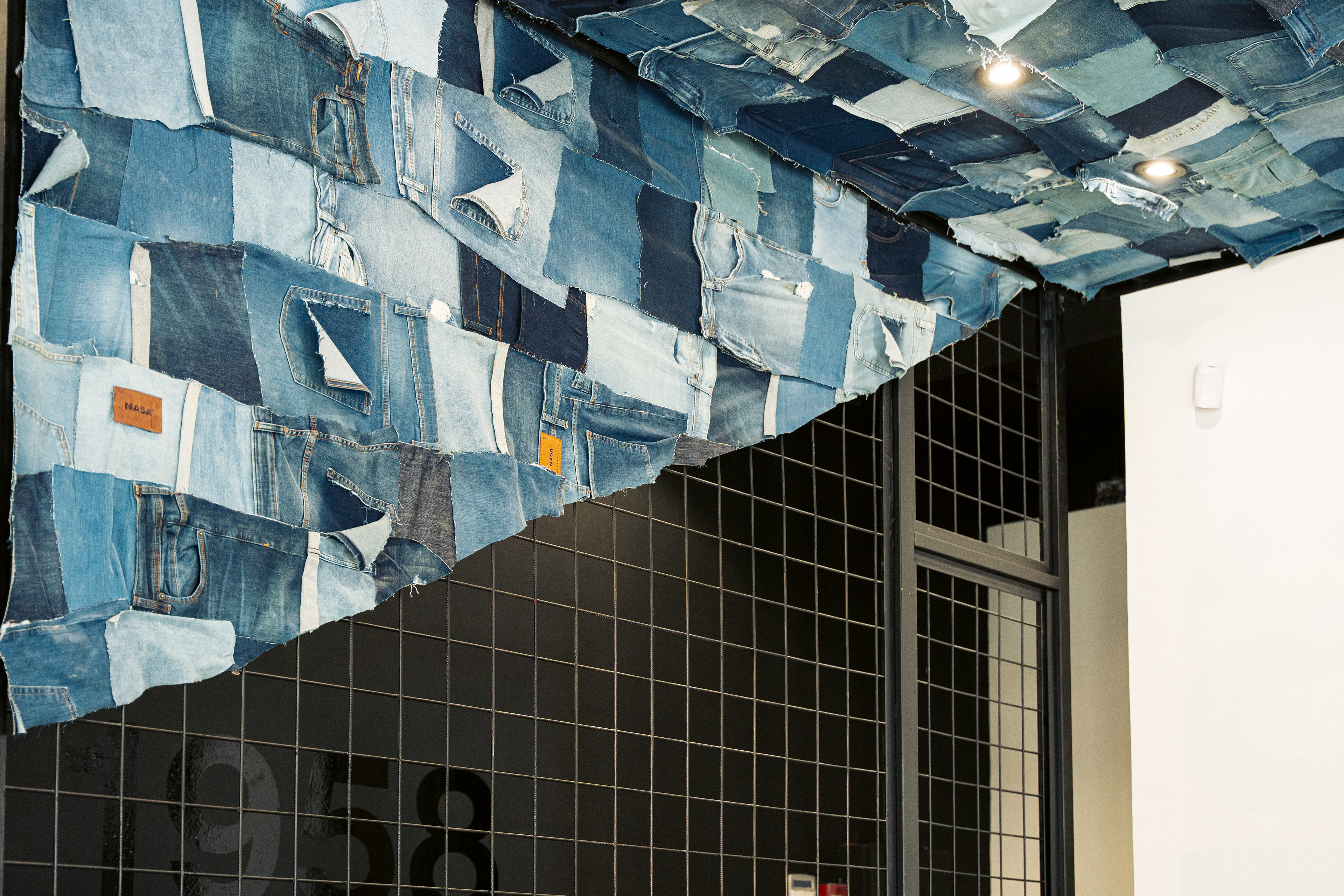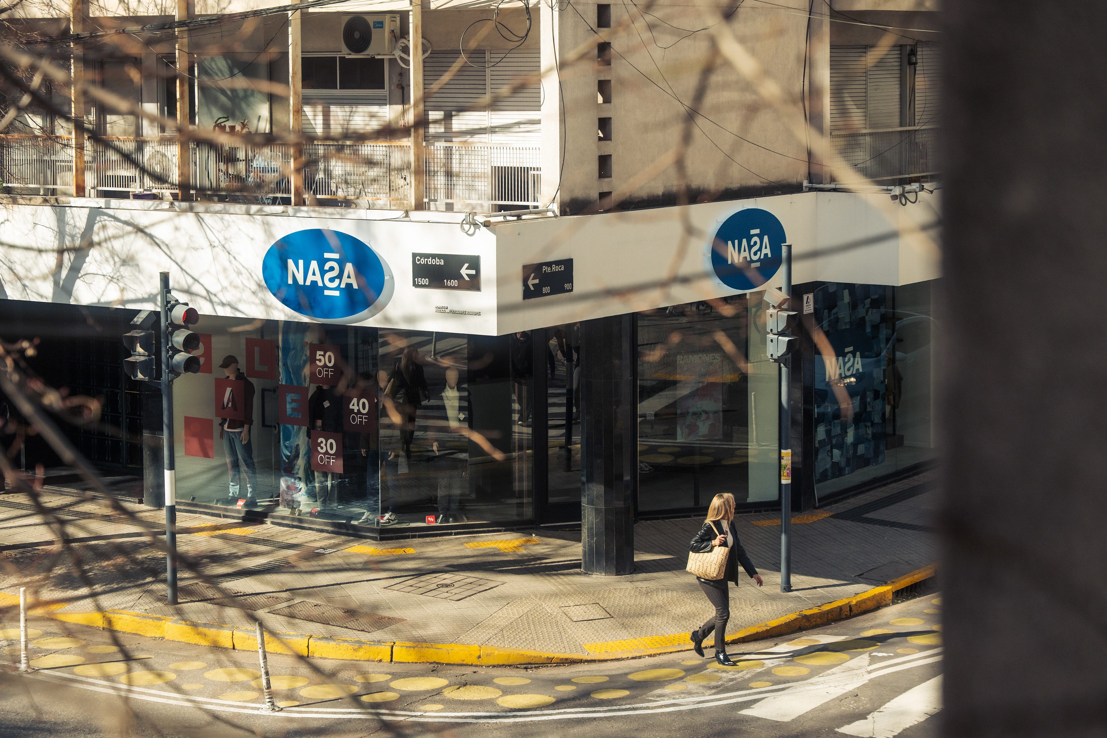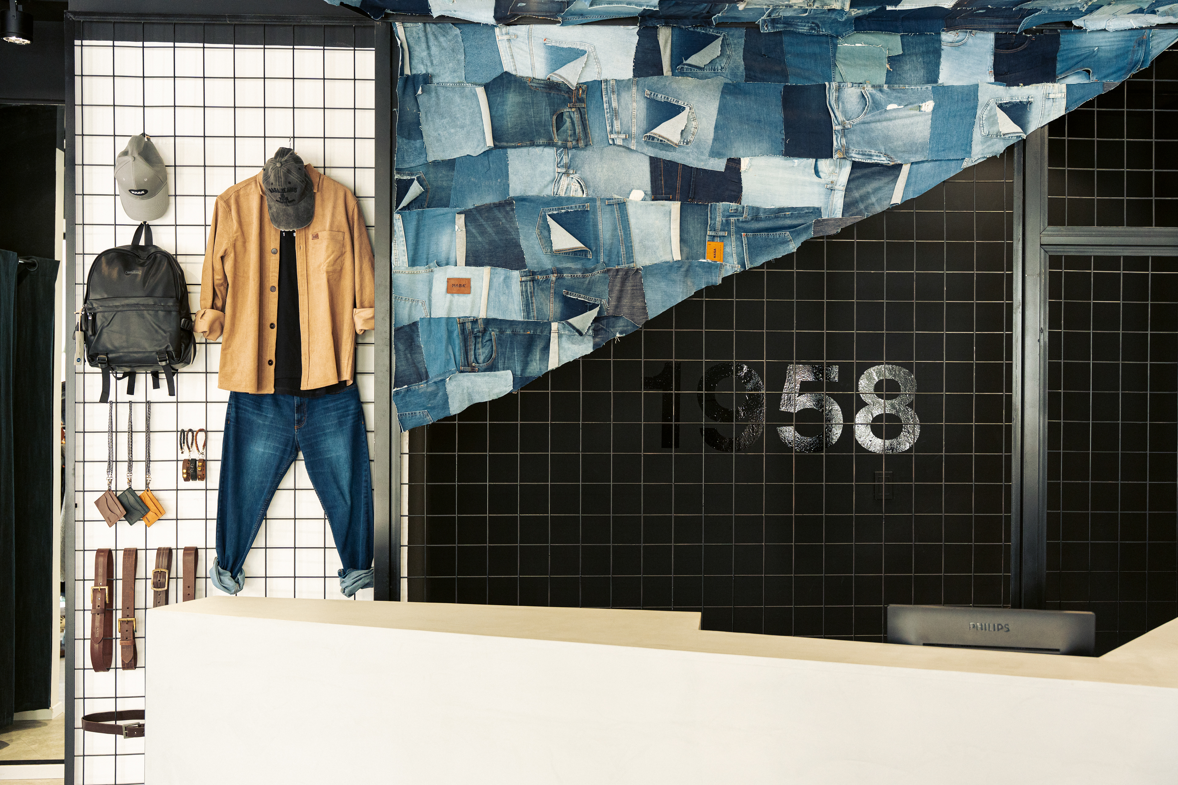 El diseño de este segundo local de indumentaria proyectado para NASA es parte de un proyecto integral bajo el concepto “la rebeldía de volver a las bases”, idea central de la nueva línea comunicacional para la marca. Por lo tanto, se trabajó aplicando el sistema identitario —retazos de jean, objetos de confección, elementos de prendas, mobiliario, pinturas con su debida paleta cromática, iluminación, etc.— adaptándolo a las nuevas características del emplazamiento; superficie pequeña y gran exposición de marca. Por ello, se decide utilizar las vidrieras no solo para exhibir prendas, sino también para comunicar a los transeúntes la nueva presencia de NASA con local exclusivo en el centro de la ciudad de Rosario. Así, mediante una única operación se resuelven ambas cuestiones: se proyecta un tabique sobre la vidriera de calle Pte. Roca revestido en retazos de jean, con el logotipo como protagonista; mientras que, del lado interior del tabique, se pintó el mural interactivo que permite ampliar la superficie de exhibición de prendas dentro del local.