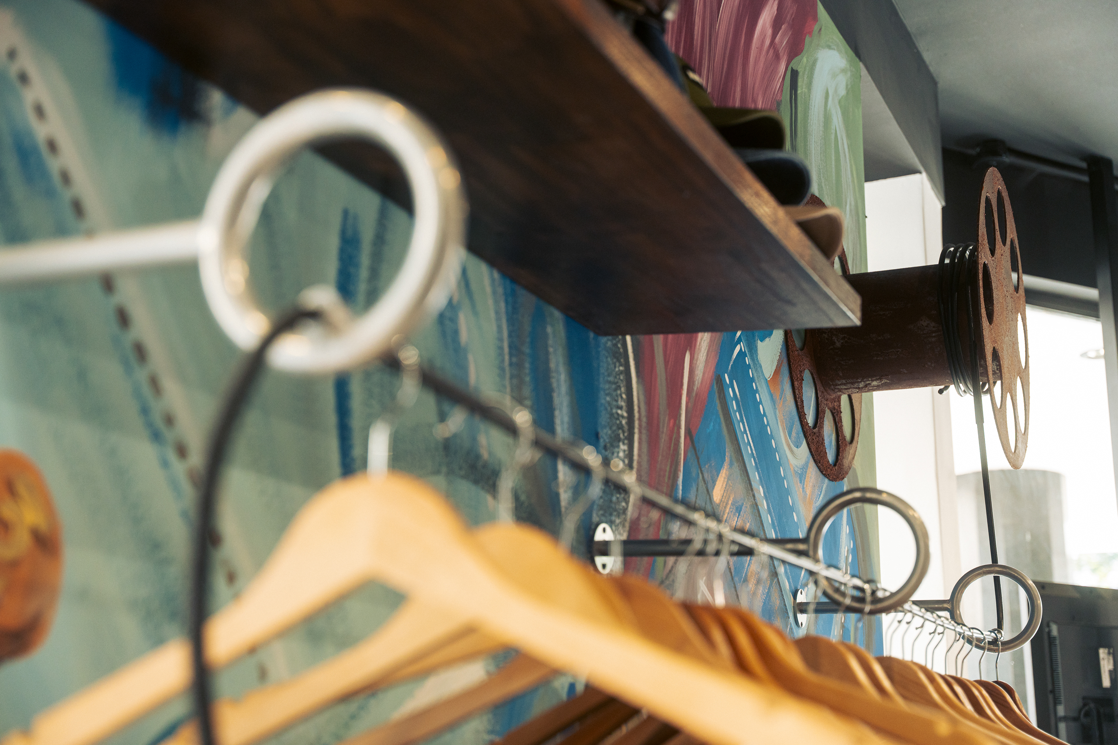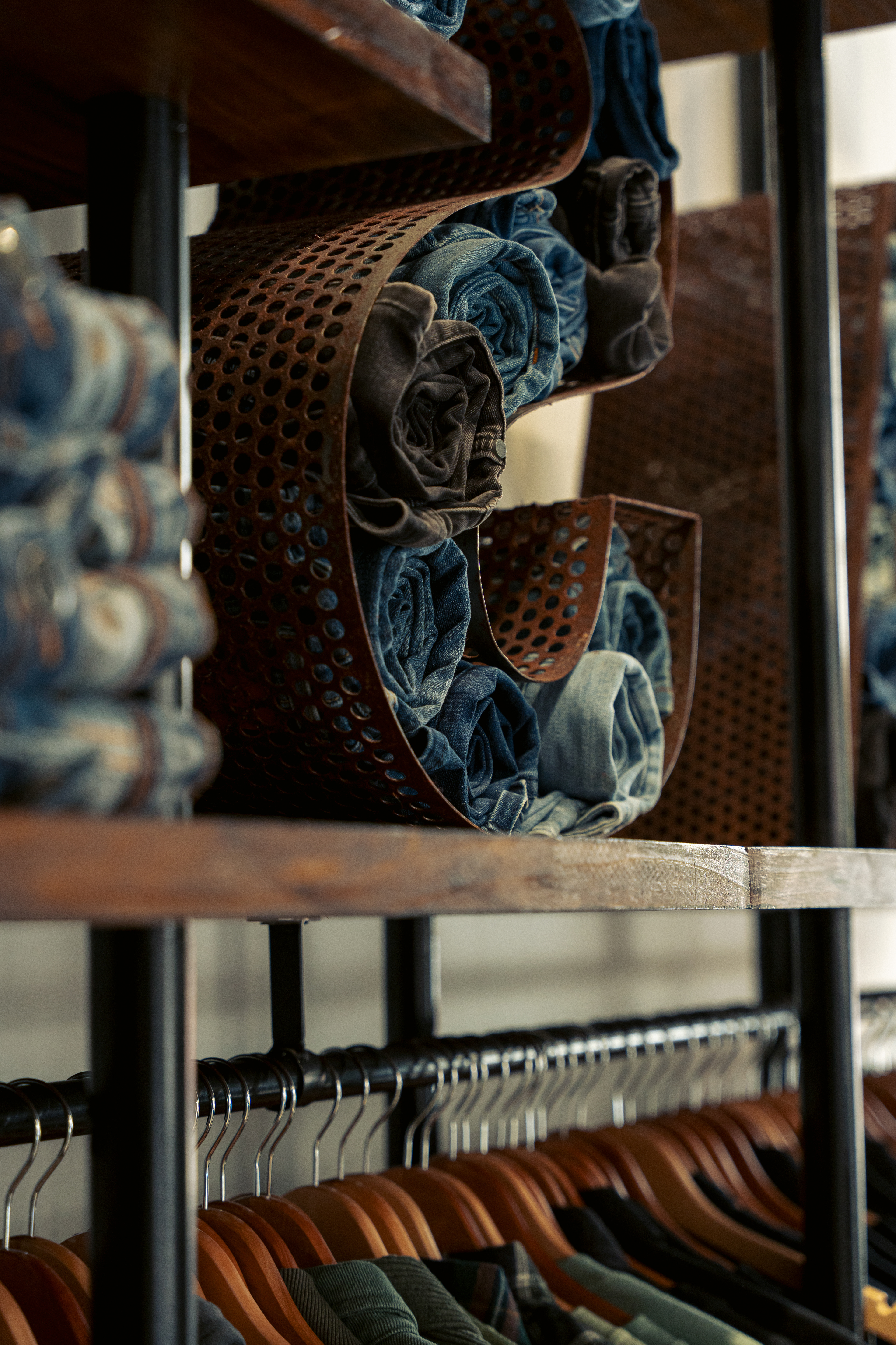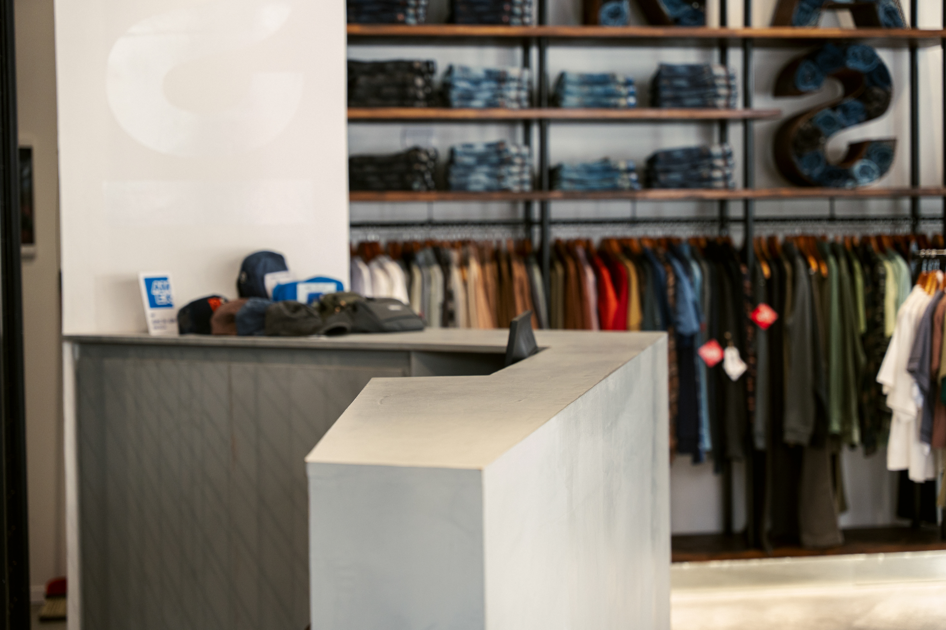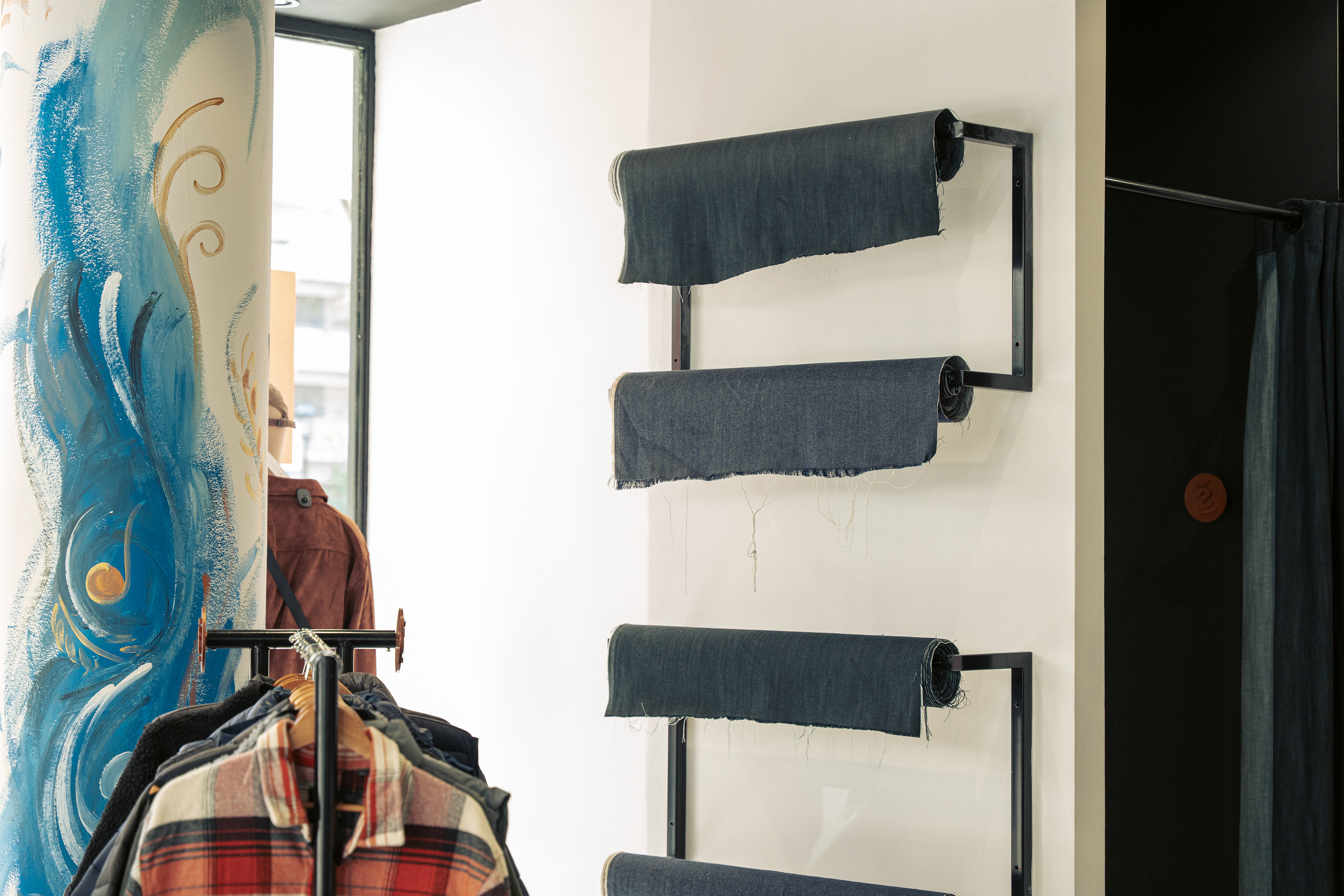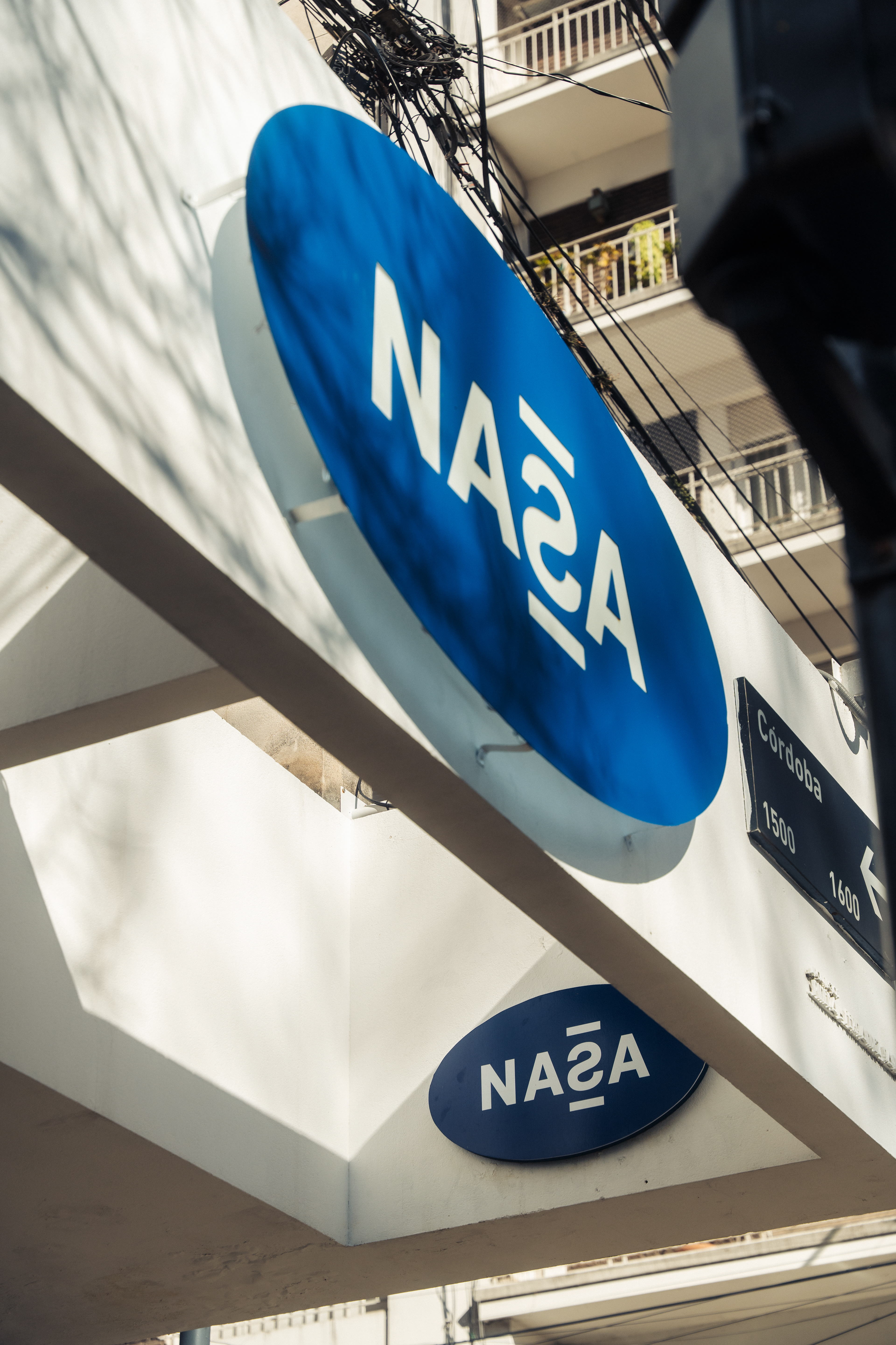 El diseño de este segundo local de indumentaria proyectado para NASA es parte de un proyecto integral bajo el concepto “la rebeldía de volver a las bases”, idea central de la nueva línea comunicacional para la marca. Por lo tanto, se trabajó aplicando el sistema identitario —retazos de jean, objetos de confección, elementos de prendas, mobiliario, pinturas con su debida paleta cromática, iluminación, etc.— adaptándolo a las nuevas características del emplazamiento; superficie pequeña y gran exposición de marca. Por ello, se decide utilizar las vidrieras no solo para exhibir prendas, sino también para comunicar a los transeúntes la nueva presencia de NASA con local exclusivo en el centro de la ciudad de Rosario. Así, mediante una única operación se resuelven ambas cuestiones: se proyecta un tabique sobre la vidriera de calle Pte. Roca revestido en retazos de jean, con el logotipo como protagonista; mientras que, del lado interior del tabique, se pintó el mural interactivo que permite ampliar la superficie de exhibición de prendas dentro del local.