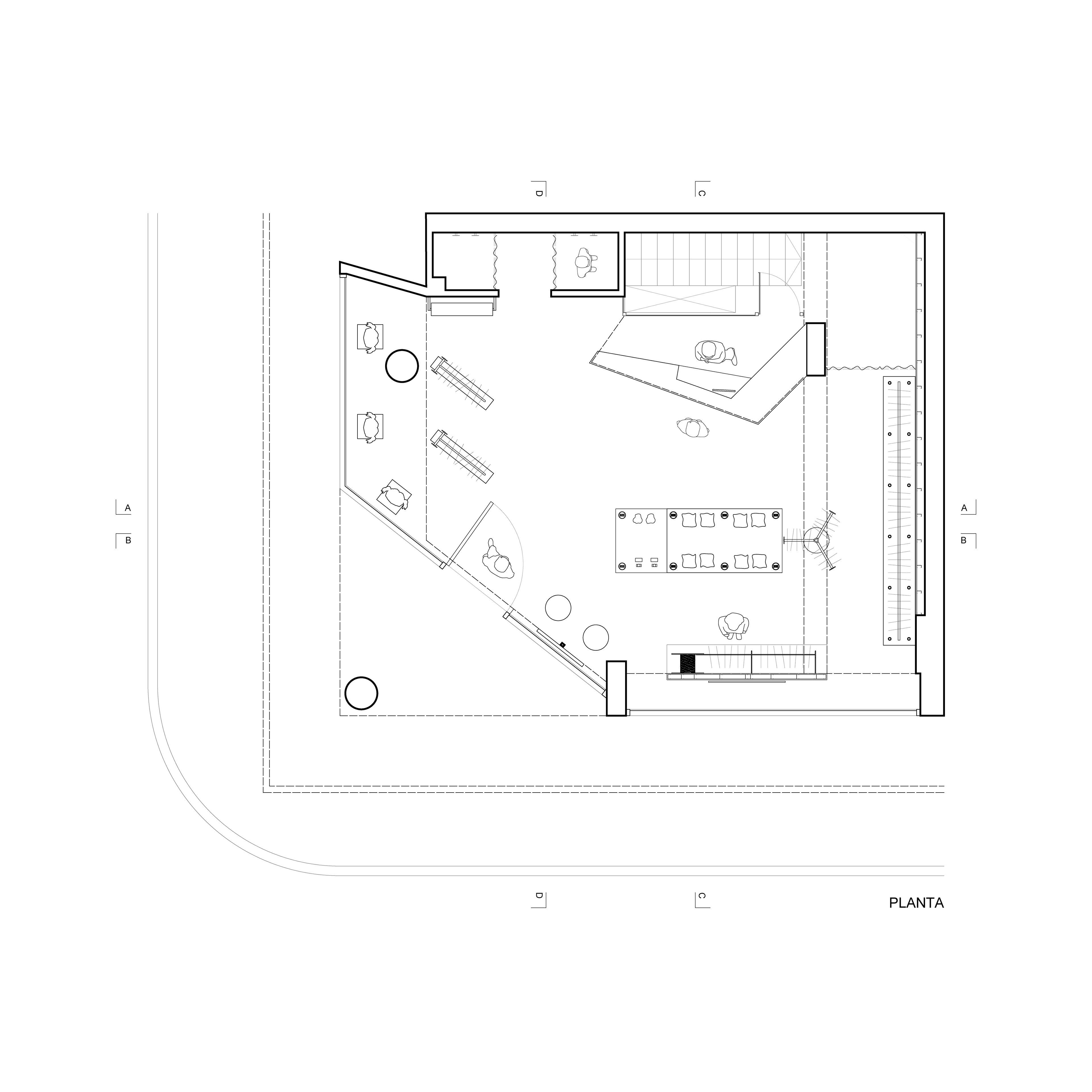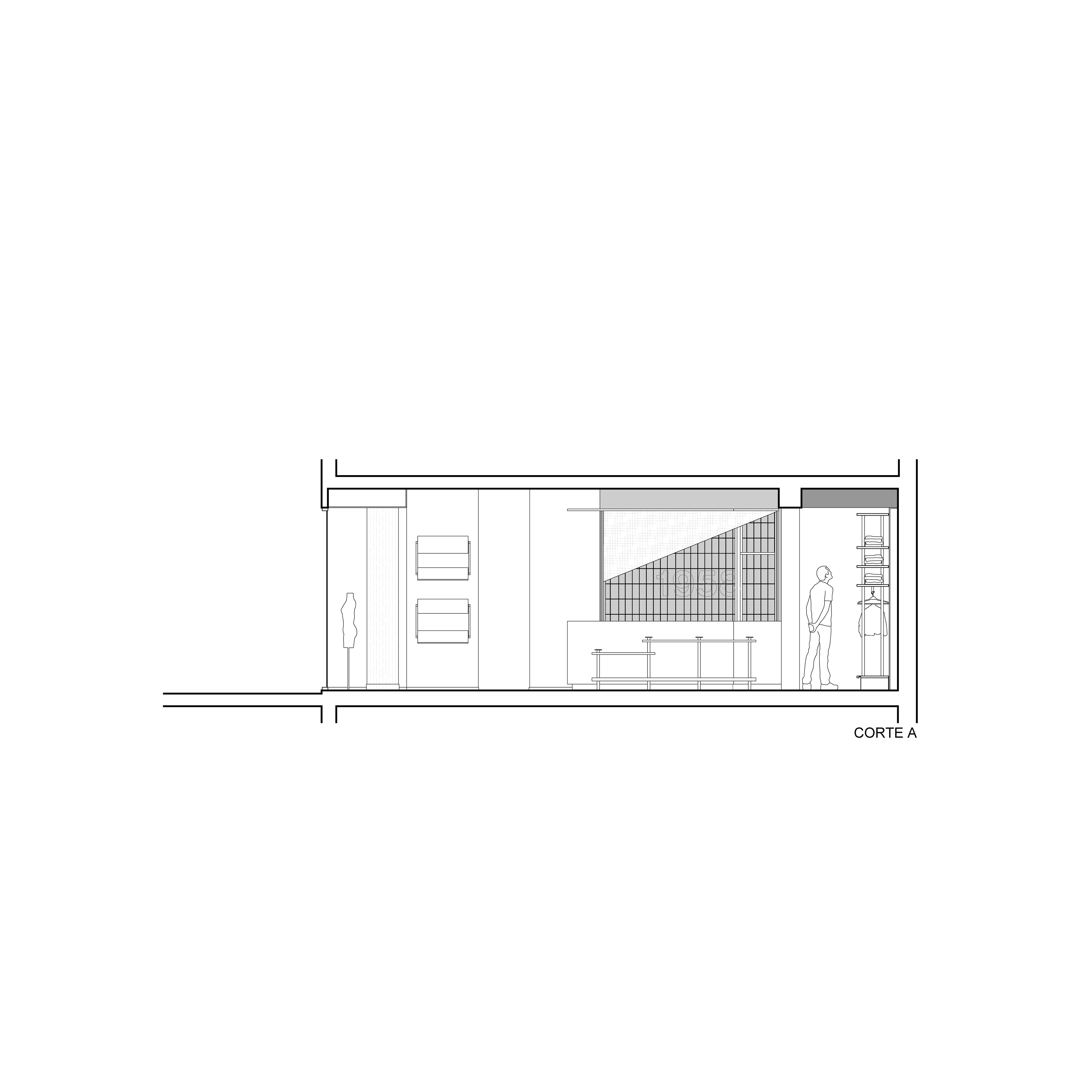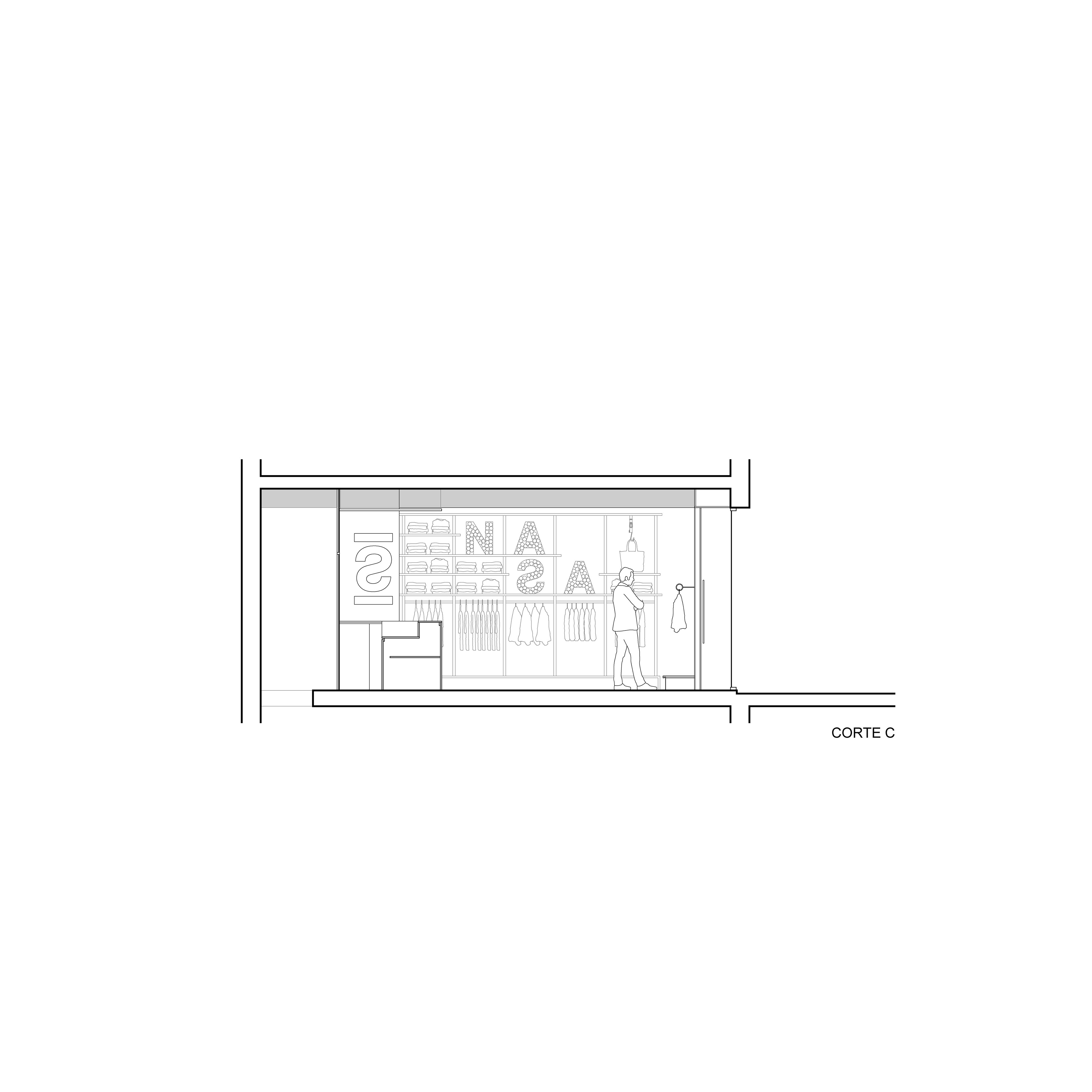 En cuanto a la distribución interior se pensó en una circulación perimetral que rodea una gran mesa expositora de diferentes niveles. Además, el mueble mostrador no solo responde a la logística de venta, sino que, gracias a su geometría, minimiza la interferencia en la circulación y funciona como recibidor enfrentándose al ingreso por la ochava, estableciendo una rápida comunicación entre visitante y vendedor.