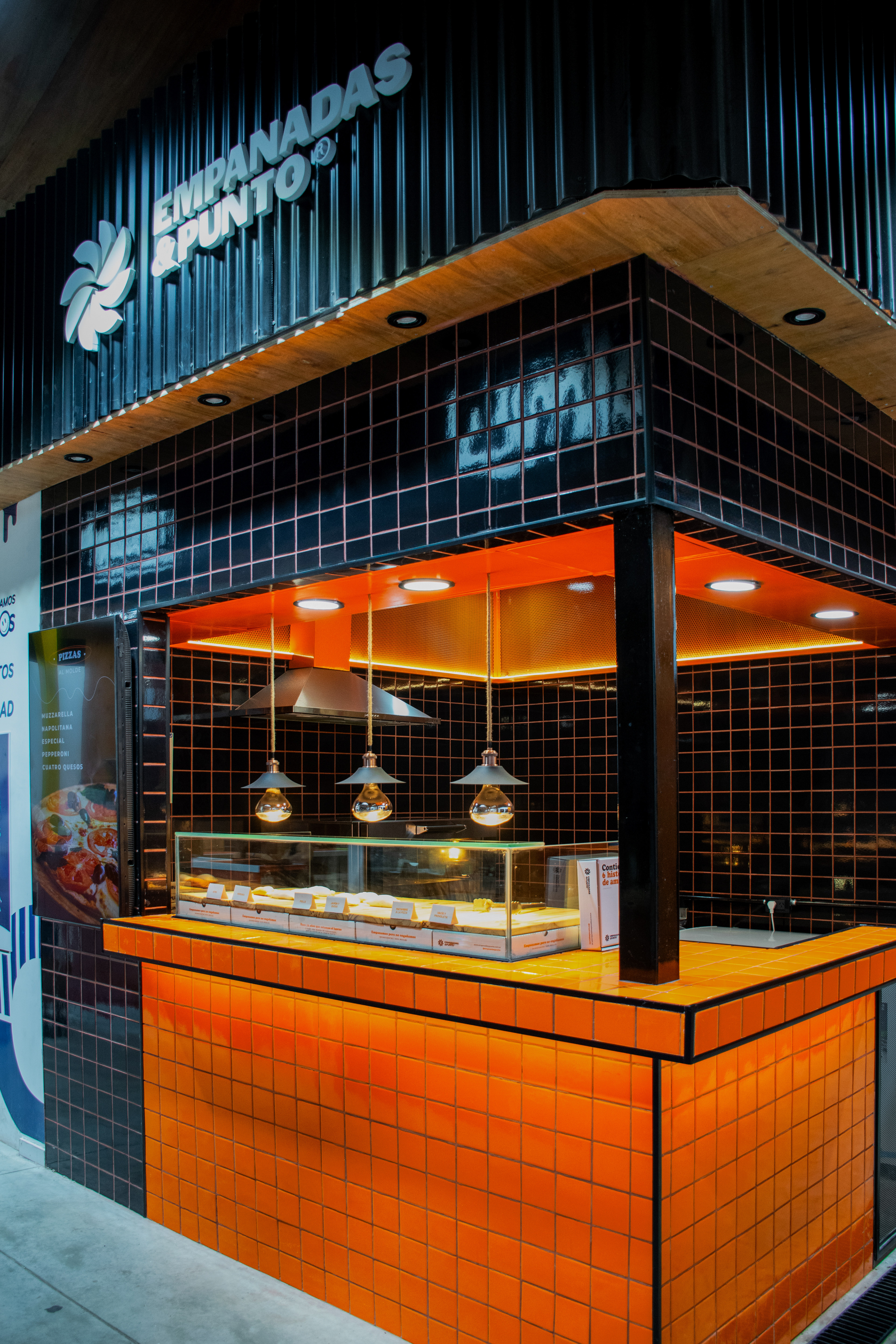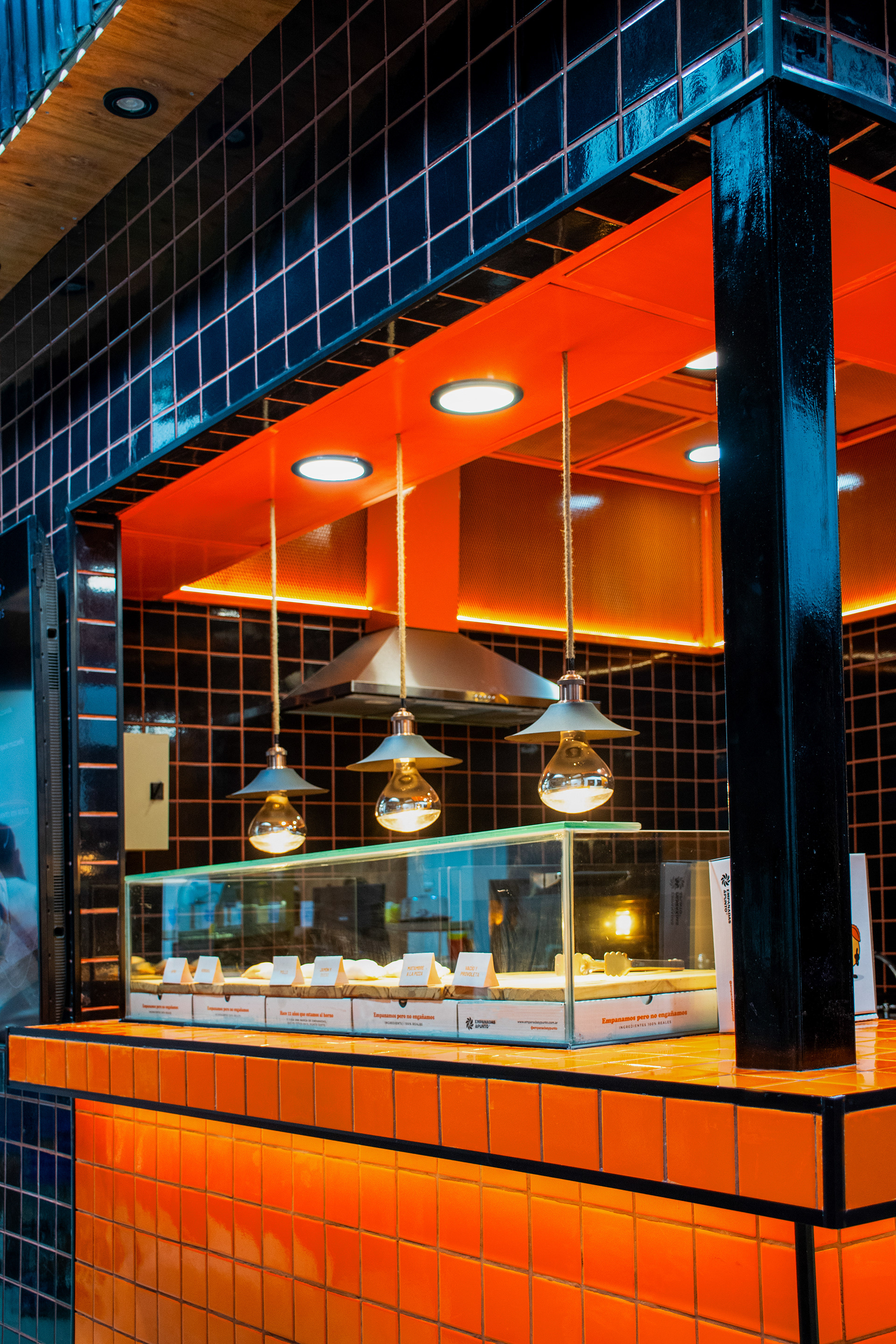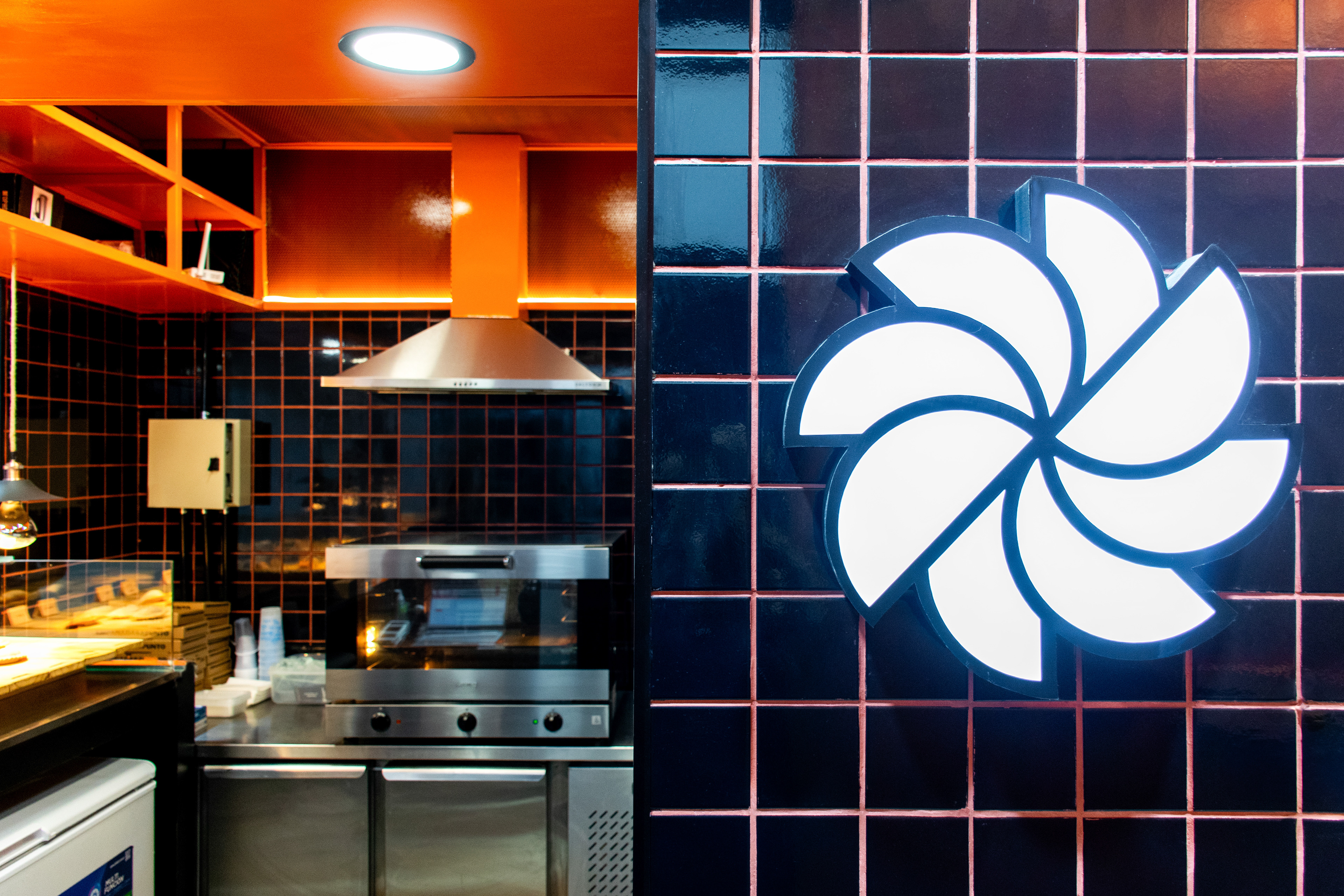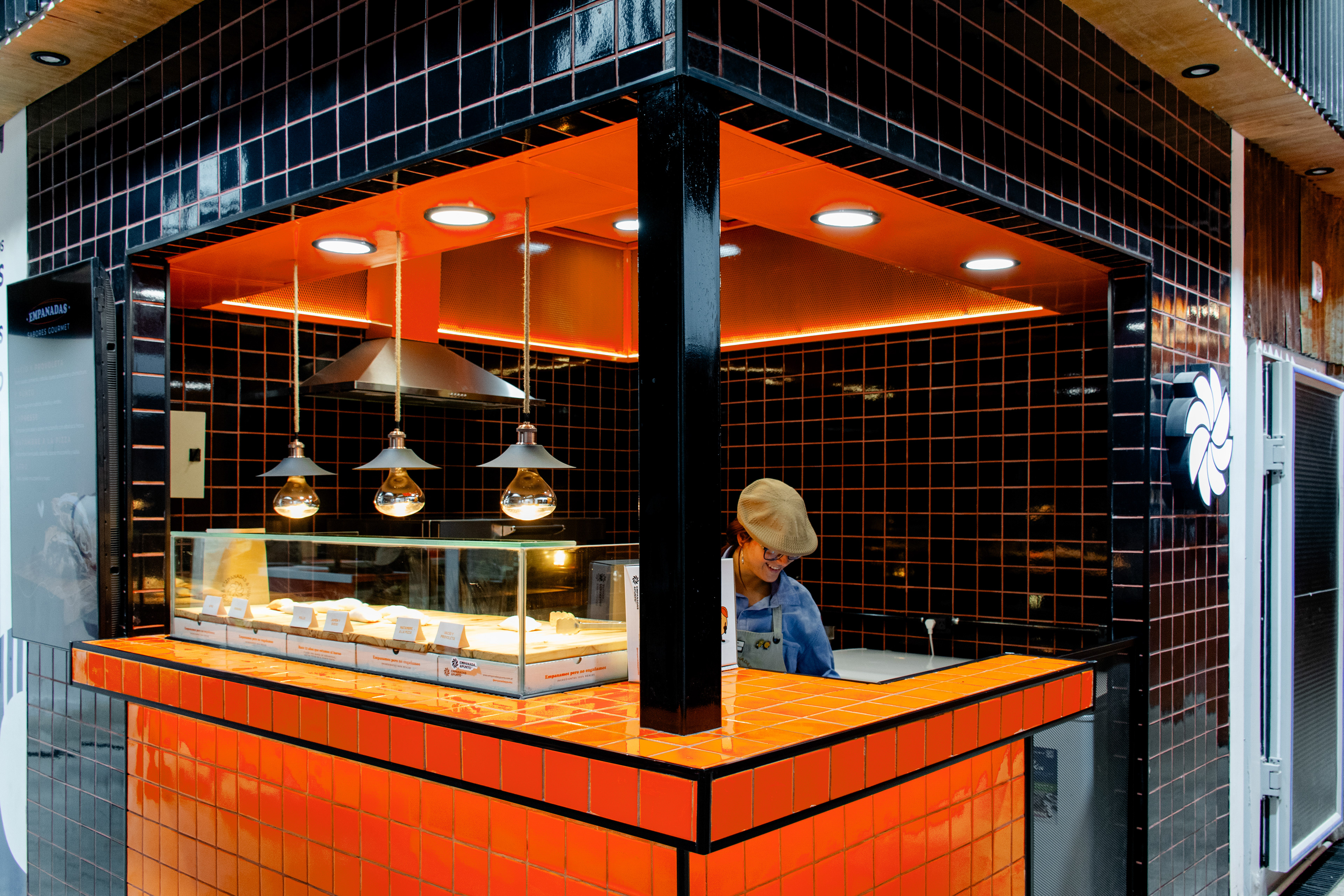 El proyecto tomó como base el lenguaje desarrollado para el local de San Lorenzo 1116: azulejo 10×10 en negro y naranja, una paleta que condensa la identidad de la marca buscando semantizar el aspecto casero y cálido del producto, sin perder de vista la velocidad en el despacho.