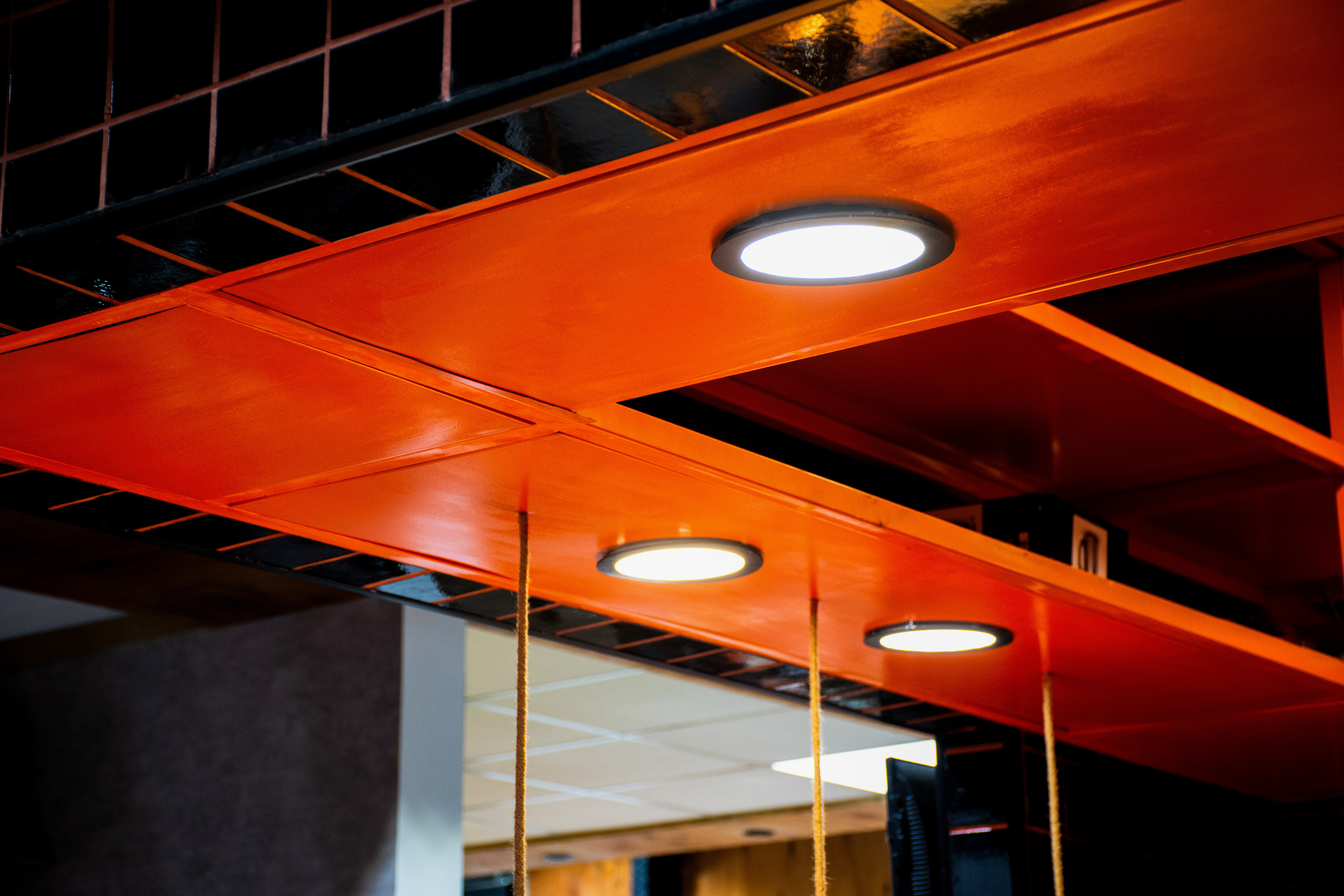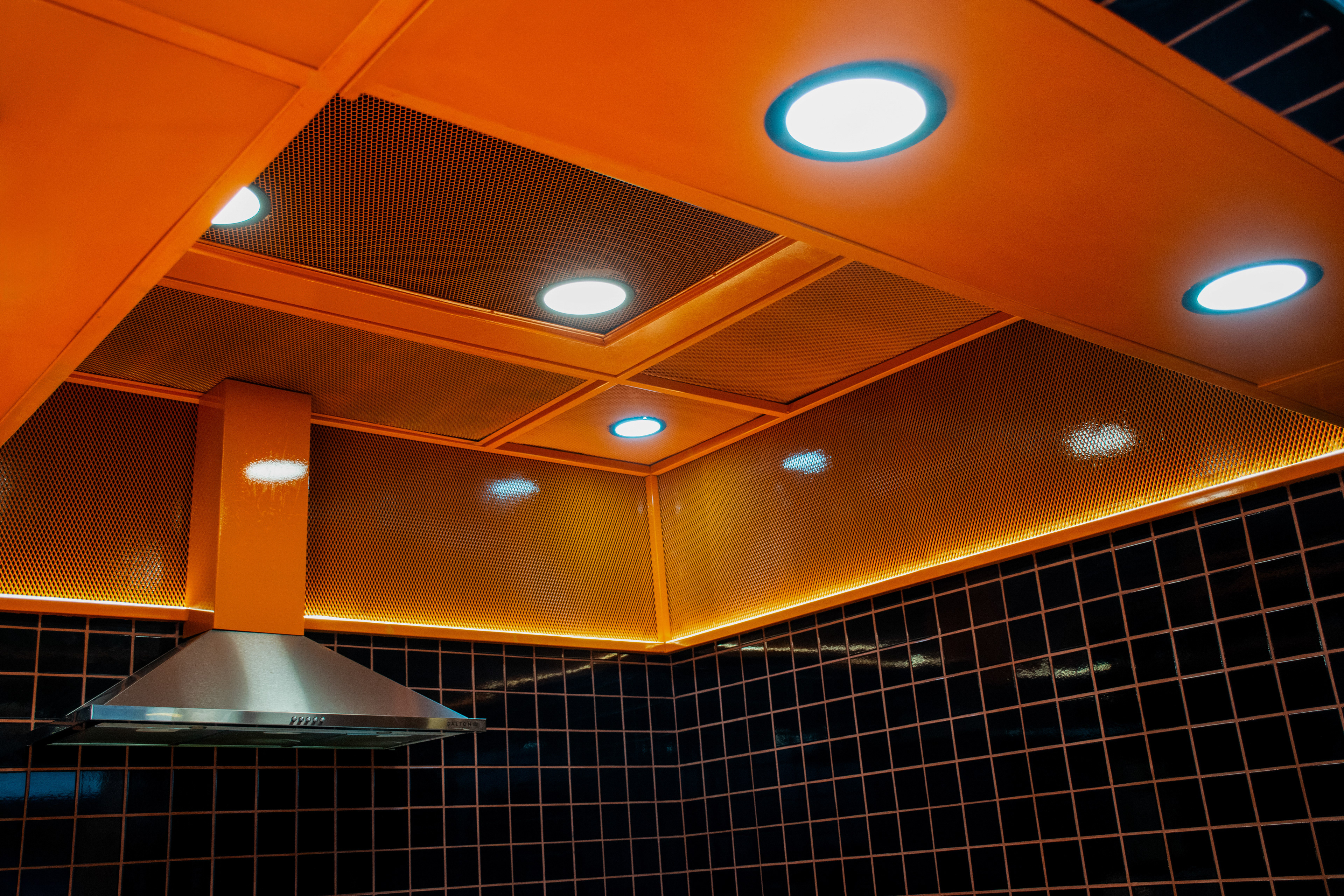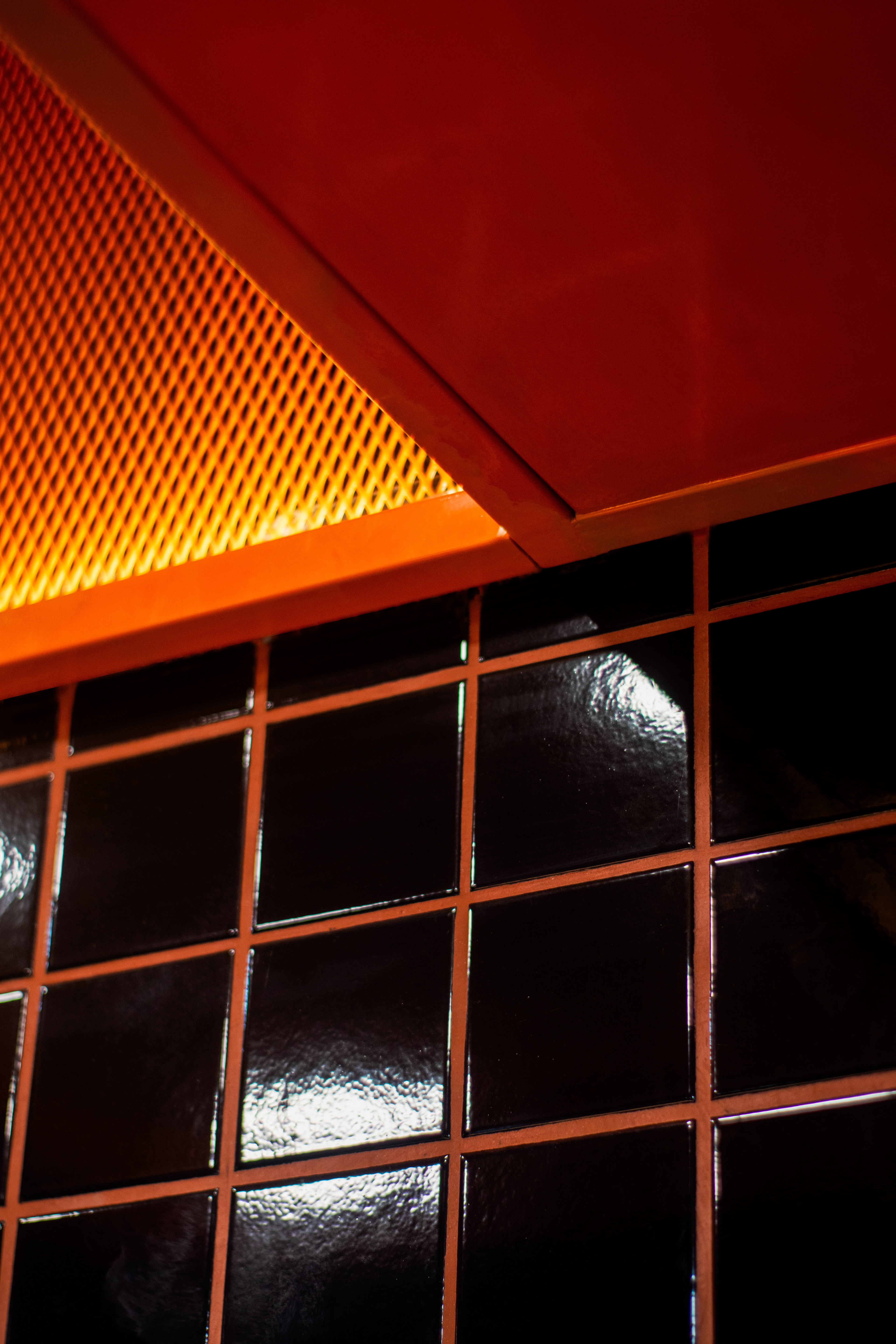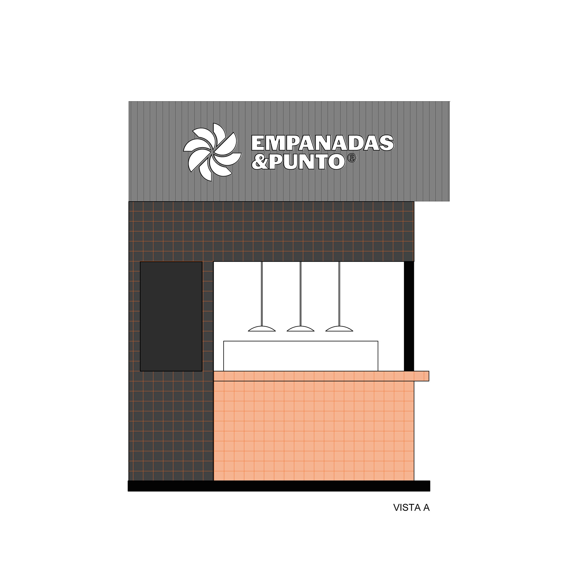 El proyecto tomó como base el lenguaje desarrollado para el local de San Lorenzo 1116: azulejo 10×10 en negro y naranja, una paleta que condensa la identidad de la marca buscando semantizar el aspecto casero y cálido del producto, sin perder de vista la velocidad en el despacho.